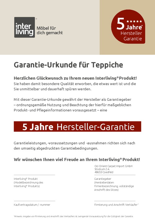 Der Teppich ist in acht verschiedenen Größen bestellbar und lässt sich perfekt auf den jeweiligen Raum abstimmen. Mit 5 Jahren Herstellergarantie bietet die Serie dir zusätzliche Sicherheit und Vertrauen in die Qualität.