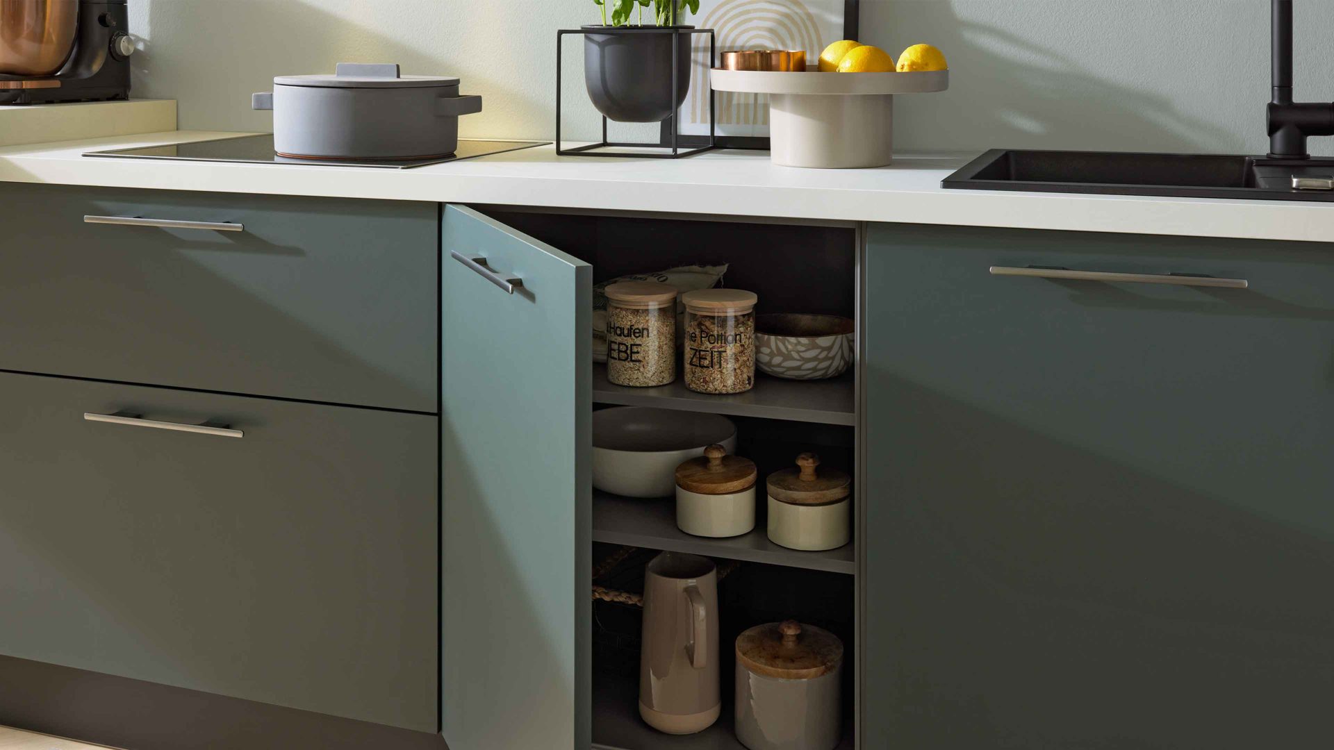Die Interliving Küche Serie 3059 vereint matte schwarzgrüne Fronten mit einem quarzgrauen Korpus und titanfarbenen Metallgriffen. Einen besonderen Akzent setzen die Platten in weißer Marmor-Nachbildung, die der Küche eine exklusive Note verleihen. Schwarze Sockelblenden runden das modern-elegante Gesamtbild perfekt ab.