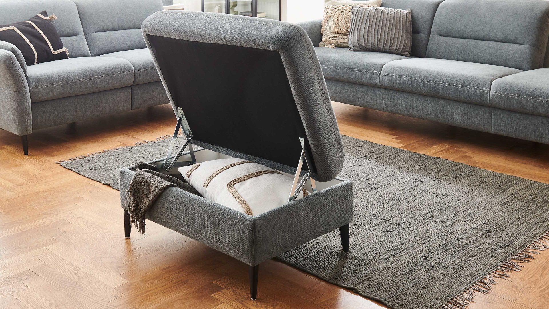 stahlfarbener Stoffbezug mit beiger Kontrast-Doppelsteppnaht