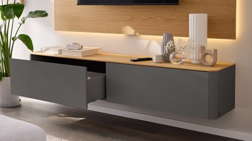 Interliving Wohnzimmer Serie 2035 – TV-Wand in dunkelgrauem Mattlack und hellem Eichefurnier