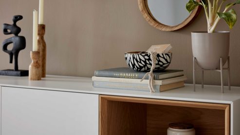 Drei Schubladen sowie mehrere Türen und eine Klapptür schaffen vielseitige Möglichkeiten zur Aufbewahrung. Hinter den Türen stehen dir zwei höhenverstellbare Einlegeböden zur Verfügung. So passt du den Stauraum flexibel an deine Bedürfnisse an.