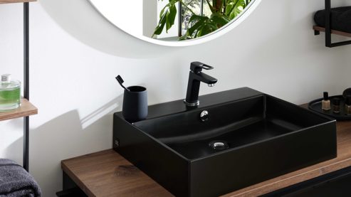 Dazu passt der mattschwarze Keramik-Aufsatzwaschtisch (Typ 87756), der durch seine edle, pflegeleichte Oberfläche und klare Formensprache besticht. Er ist mit einer Hahnlochbohrung und einem Überlauf ausgestattet und misst ca. 60 x 12 x 46 cm (B/LxHxT).