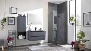 Der ca. 45 x 130 x 35 cm (BxHxT) große Midischrank (Typ 2972) mit supermatter graphitschwarzer Front, schwarzem Korpus und grifflosem Design ergänzt die Kombination perfekt. Mit Schließdämpfung, zwei höhenverstellbaren Einlegeböden, einem offenen Fach sowie einem beschichteten Abdeckboden (Typ 10838) bietet er flexible Organisation und Platz für Handtücher, Pflegeprodukte und Accessoires.