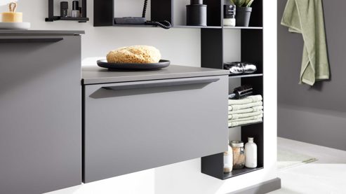 Alle Schubladen und Türen verfügen über Softclose-Technik mit Selbsteinzug, sodass alles leise und schonend schließt. Gleichzeitig handelt es sich um ein individuell planbares Badmöbelprogramm, mit dem du dein Bad passgenau und stilvoll gestalten kannst.
