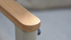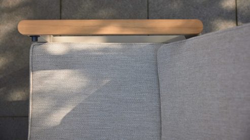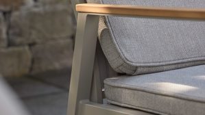 Das taupefarben pulverbeschichtete Aluminiumgestell ist korrosionsbeständig und pflegeleicht. Die Teakholz-Armlehnen setzen einen warmen, natürlichen Akzent und runden den Look des Outdoor-Armlehnstuhls wunderschön ab.