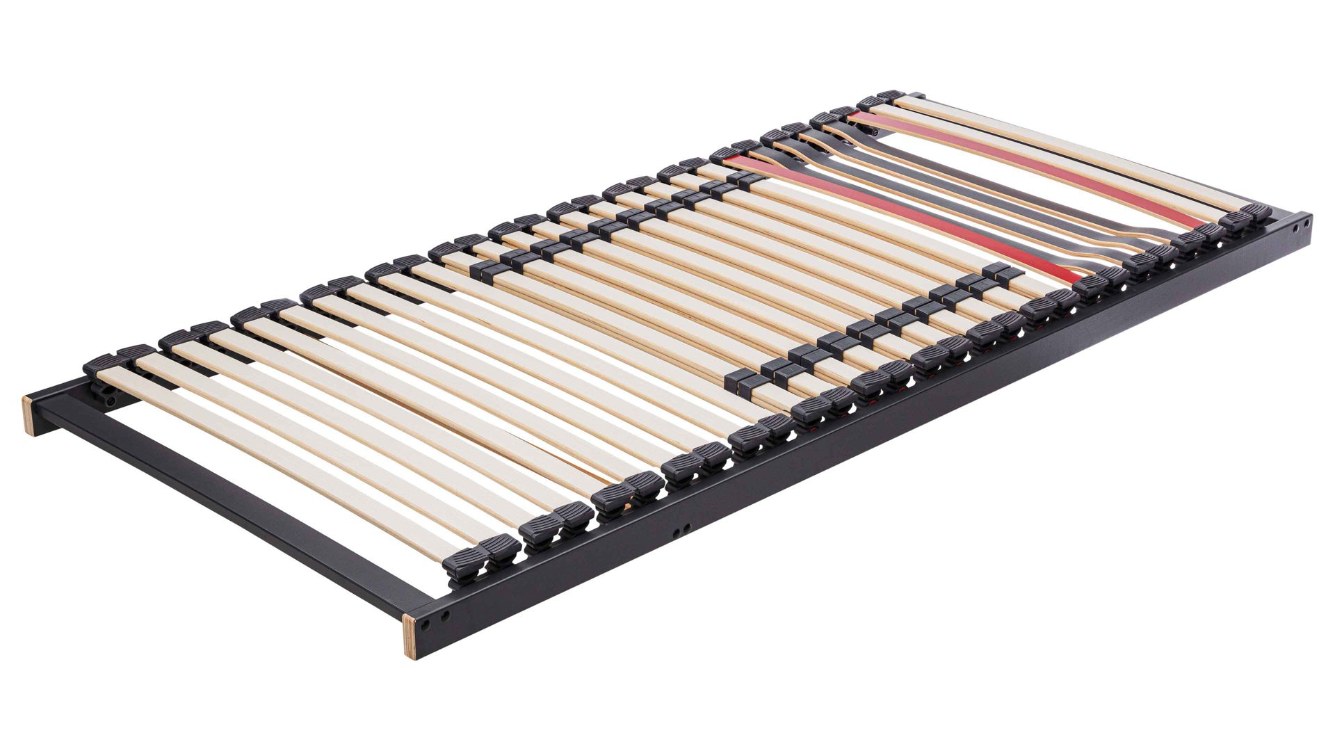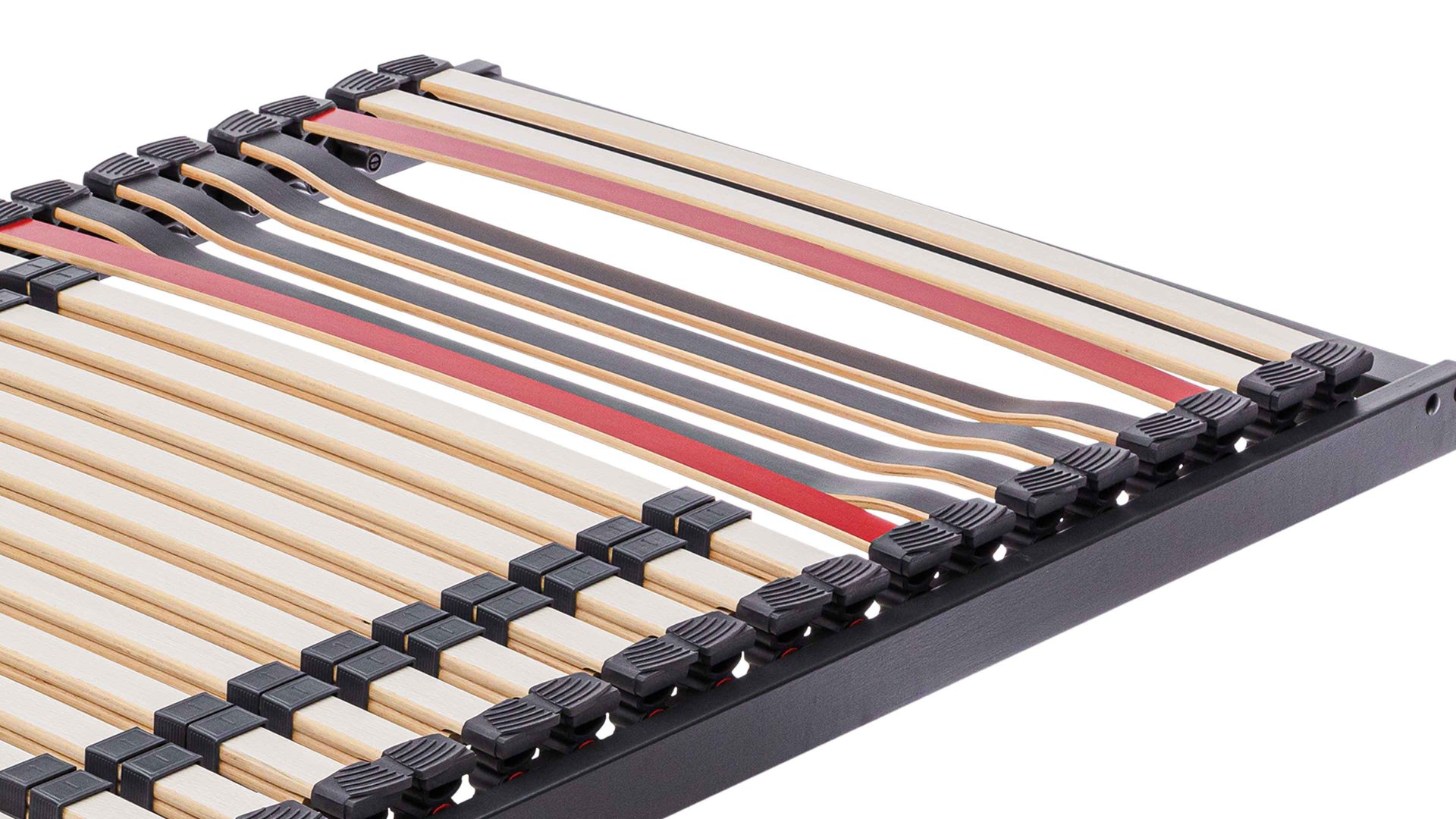 Die elastischen Federleisten sind in überstehenden, äußerst robusten Hightech-Kappen gelagert. Ergänzt wird die stabile Konstruktion durch verstärkte Querleisten mit Winkelsicherung und hochfeste Gelenkschrauben. Diese Kombination sorgt für außergewöhnliche Stabilität – auch bei hoher und dauerhafter Belastung.