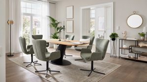 Auch beim Untergestell kannst du kreativ werden: Die Serie hält verschiedene Gestellvarianten für Tische und Stühle bereit, damit alles perfekt zusammenpasst. Die Stühle selbst bekommst du wahlweise mit oder ohne Drehfunktion, und bei den Bezügen hast du die Wahl zwischen Leder, Stoff oder einem modernen Materialmix.