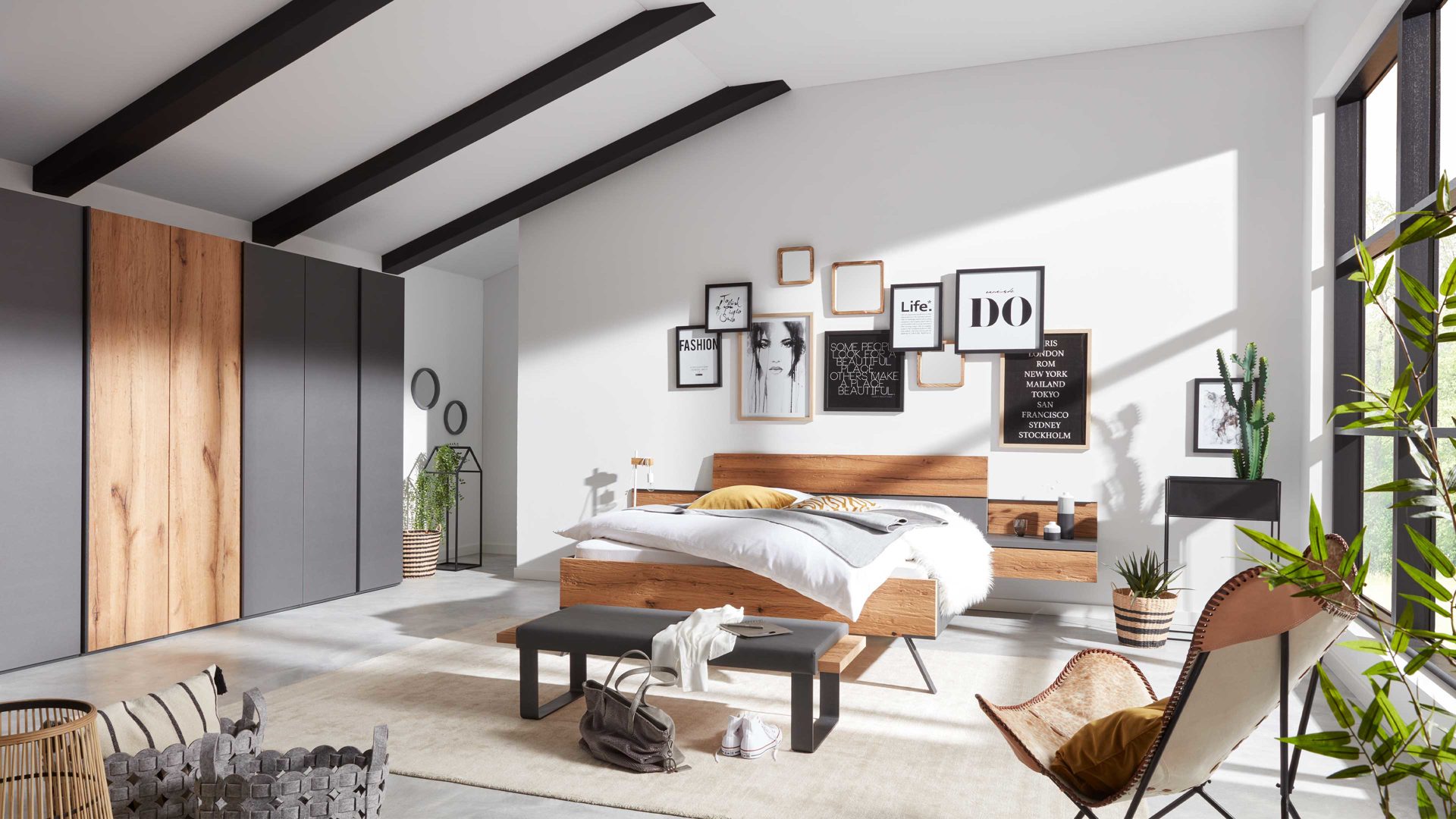 Das vierteilige Komplettzimmer aus der Interliving Schlafzimmer Serie 1025 bringt dir ein perfekt aufeinander abgestimmtes Set ins Zuhause: Doppelbettgestell, zwei Hänge-Nachtkonsolen und ein geräumiger Kleiderschrank. Der Mix aus trendigem, graphitfarbenem Mattlack und robuster Balkeneiche gehackt verleiht deinem Schlafzimmer eine Mischung aus moderner Eleganz und natürlicher Gemütlichkeit. Graphitfarbene Metallelemente mit Eisenglimmerlack runden den Look stilvoll ab.