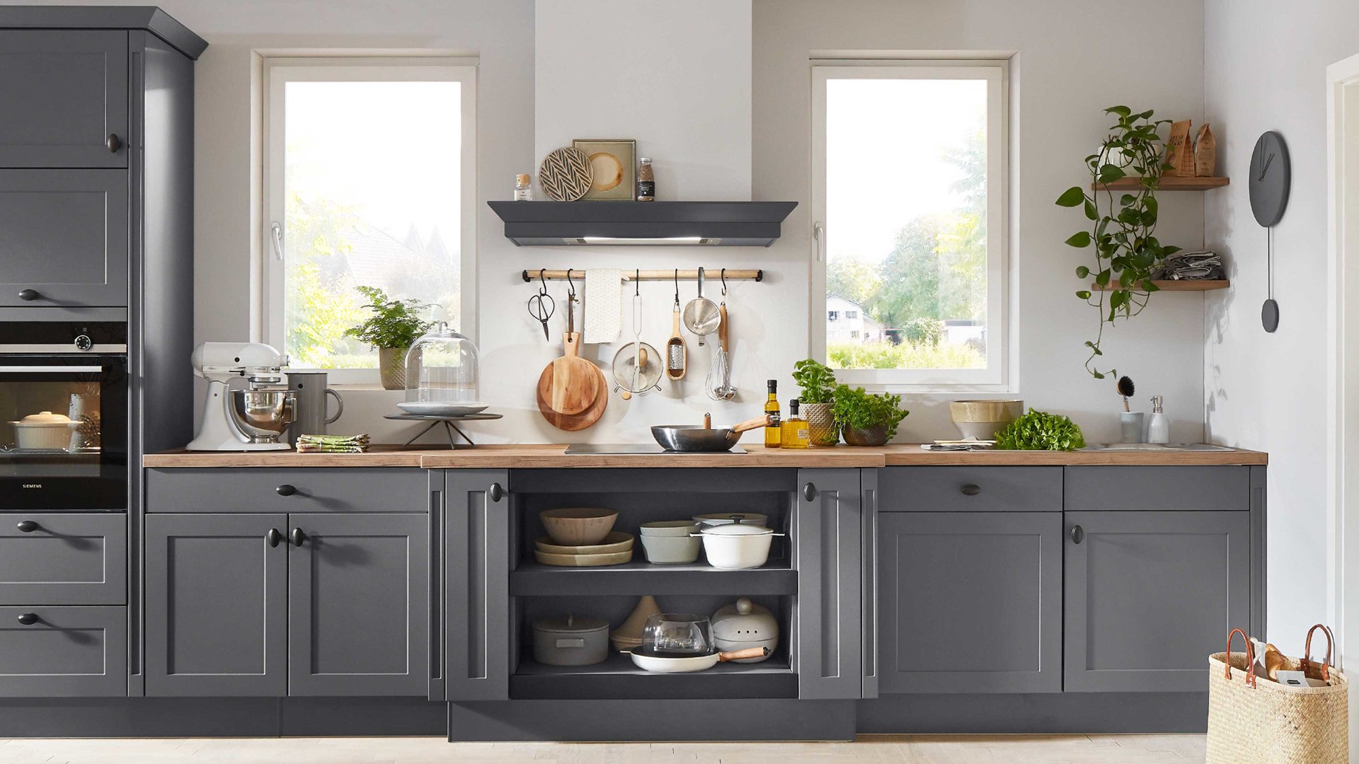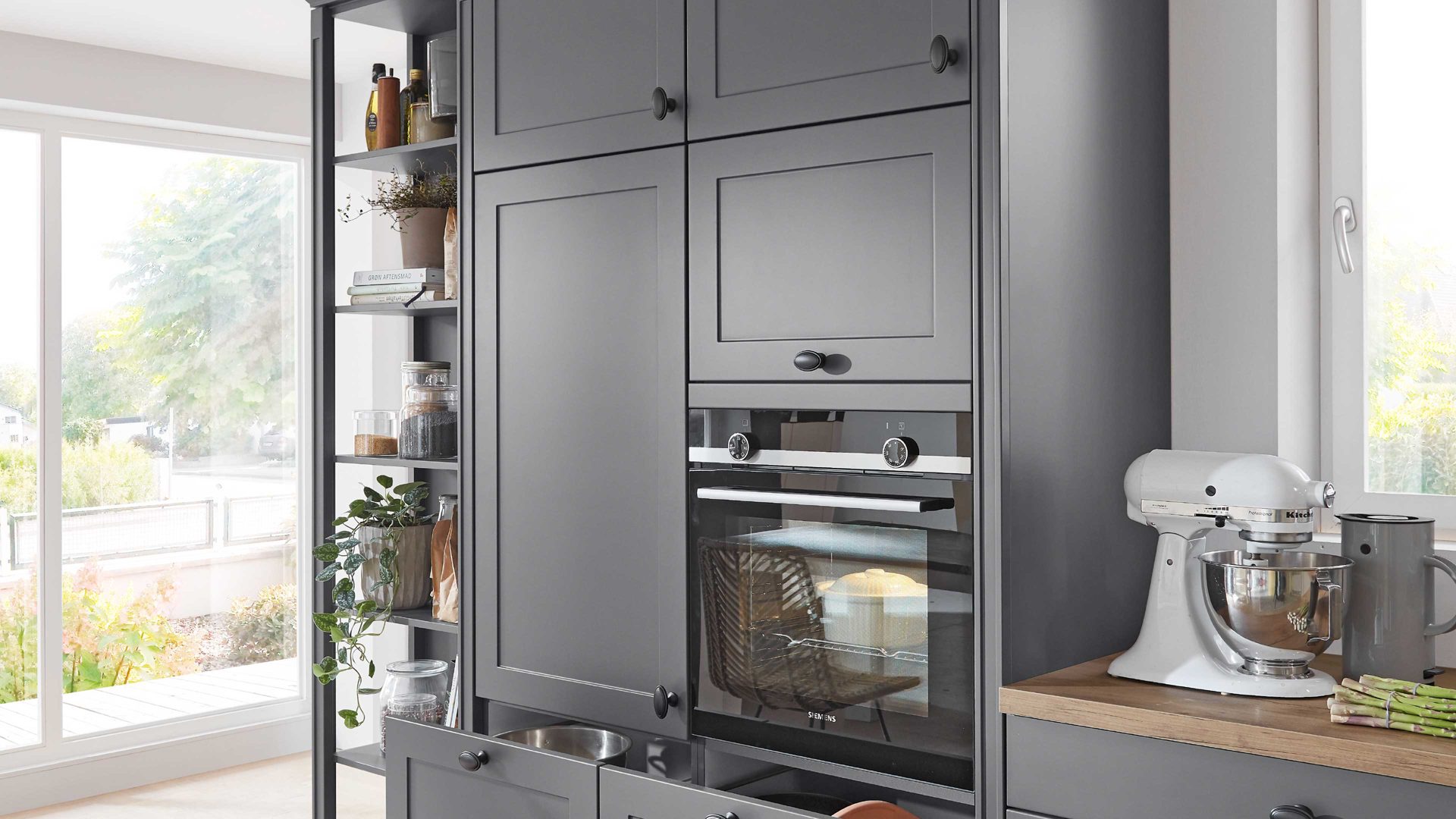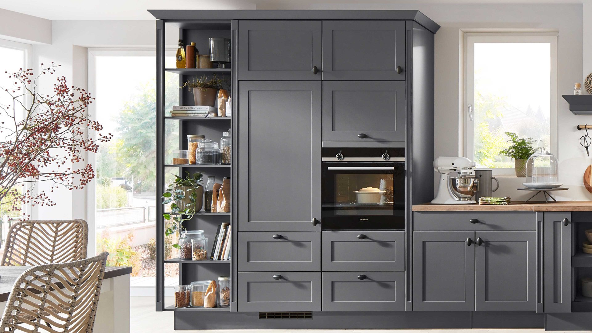 Die nobilia® Einbauküche Nordic kombiniert mattes Schiefergrau als echte Trendfarbe mit einer Arbeitsplatte in Taxus-Nachbildung, die warmen Naturcharme verströmt.