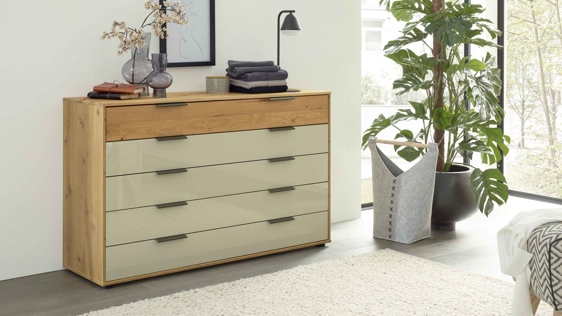 Das Komplettzimmer aus der Interliving Schlafzimmer Serie 1027 vereint natürliche Holzoptik mit eleganten Glaselementen und schafft so ein Schlafzimmerambiente, das Wärme und Modernität perfekt miteinander verbindet. Eiche bianco, champagnerfarbenes Glas und schieferfarbene Metallakzente harmonieren wunderbar mit dem massiven Riffholz an Schrank und Kopfteil. Das Ergebnis ist eine edle, wohnliche Atmosphäre mit viel Charakter.