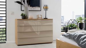 Die Kommode lässt sich hervorragend als Beistellschrank oder Solitärkommode einsetzen und fügt sich dank ihres klaren Designs nahtlos in dein Schlafzimmerkonzept ein – für ein harmonisches und stilvolles Gesamtbild.