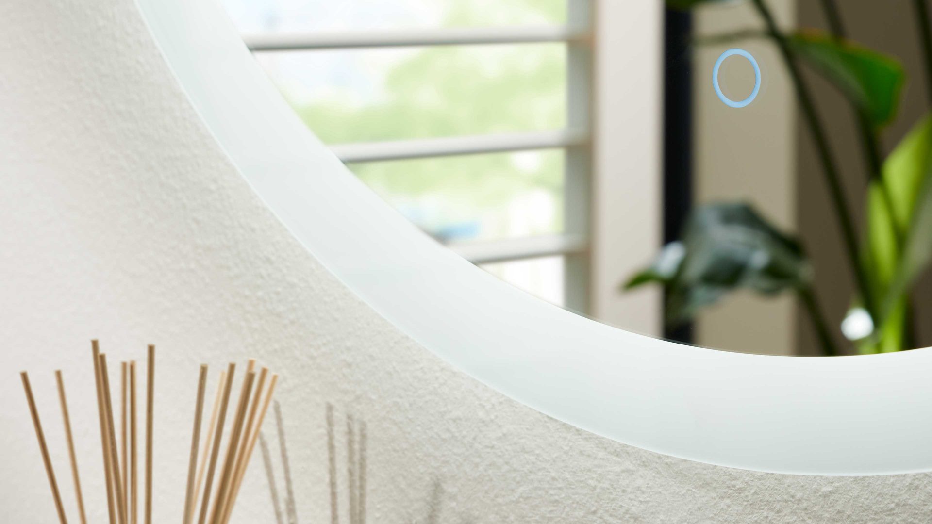 Für stimmungsvolle Beleuchtung sorgt der beleuchtete Wandspiegel (Typ 15202) mit umlaufendem sandgestrahltem LED-Lichtfenster und Touchsensor. Der Spiegel hat einen Durchmesser von ca. 75 cm, ist ca. 3 cm tief und mit einem fest verbauten, nicht austauschbaren LED-Leuchtmittel (20 Watt) der Energieeffizienzklasse F (Spektrum A bis G) ausgestattet – inklusive Konverter.
