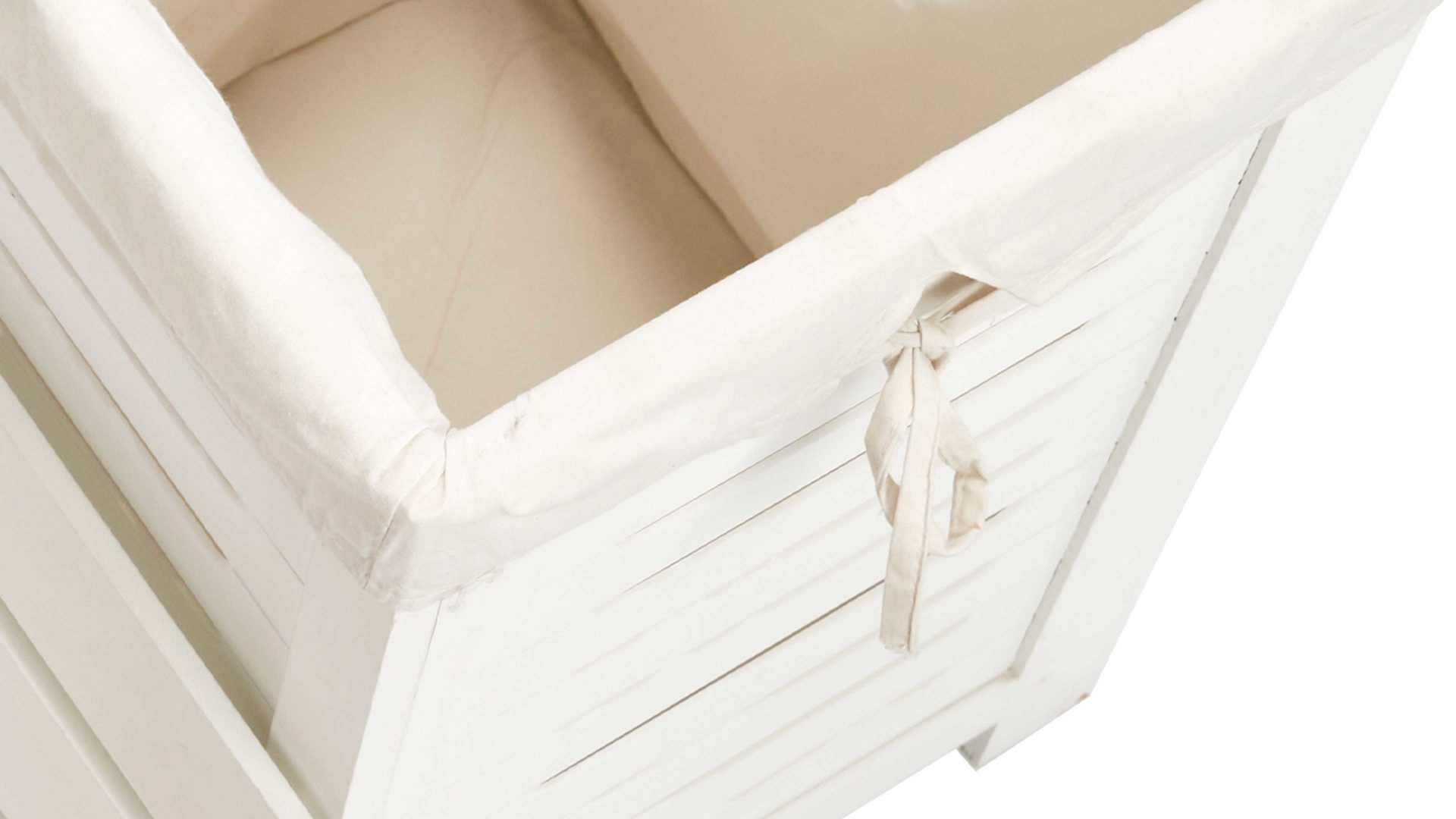 Der Korb ist aus modernem und pflegeleichtem MDF gefertigt. Durch seine weiß lackierte Oberfläche ist er nicht nur ein praktischer Alltagshelfer, sondern ein Hingucker in Ihrem Zuhause. Besonders hygienisch: Sie erhalten den Wäschekorb mit einem herausnehmbaren und waschbaren Wäschesack. Profitieren Sie von den Maßen von ca. 35 x 35 x 55 cm (BxHxT) und platzieren die Wäschetruhe neben Ihrem Bett, Kleiderschrank oder in Ihrem Badezimmer.