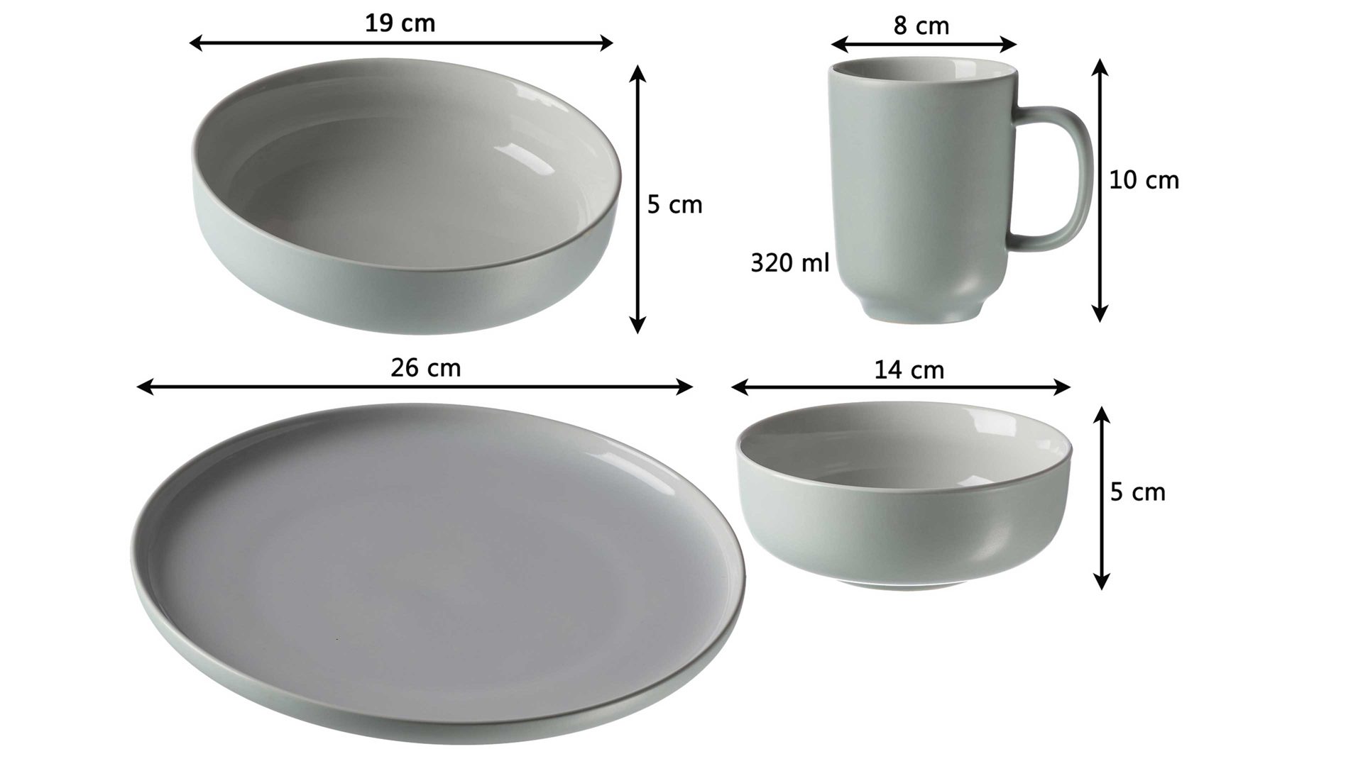 Beim stilvollen Frühstücksgeschirr handelt es sich um ein 16-teiliges Set, das sich aus vier Kaffeebechern, vier Müslischalen, vier Tellern und vier Schalen zusammensetzt. Die Kaffeebecher sind jeweils ca. 10 cm hoch und haben einen Durchmesser von ca. 8 cm, sodass sie ca. 320 ml Ihres liebsten Heißgetränks fassen. Jede Müslischale ist ca. 5 cm hoch - bei einem Durchmesser von ca. 14 cm. Bei den Tellern beläuft sich die Höhe auf ca. 3 cm, während der Durchmesser ca. 26 cm beträgt. Die Schalen messen jeweils ca. 5 cm in der Höhe und ca. 19 cm im Durchmesser.