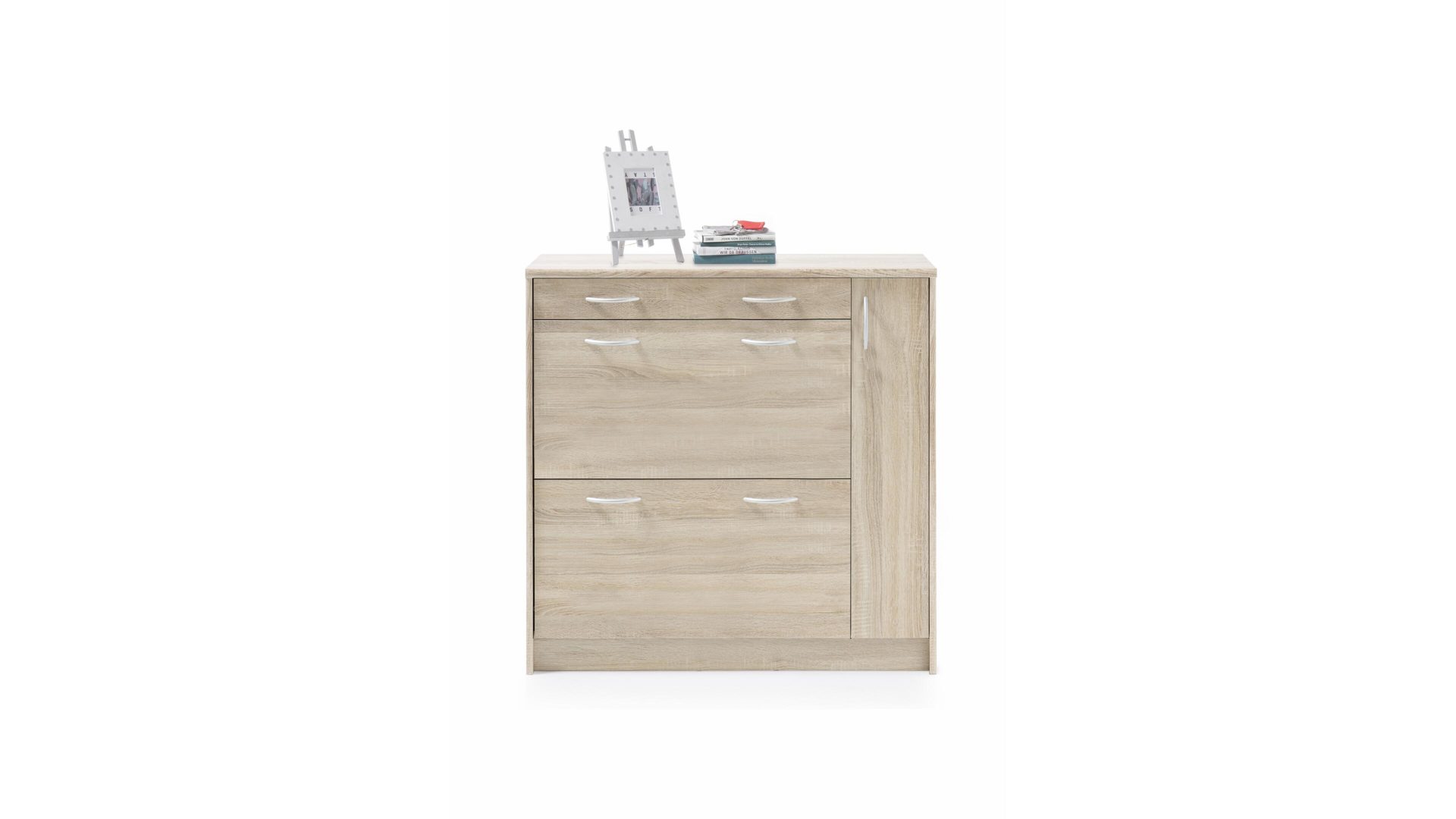 Der Schuhkipper Optimus ist enorm stilvoll designt und ausgesprochen praktisch. Mit den Sonoma eichefarbenen Kunststoffoberflächen bringt der Schuhschrank moderne Eleganz gepaart mit natürlichem Charme in den Raum, in dem Sie ihn platzieren. Akzente setzen die alufarbenen Griffe - sie heben sich einerseits ab, verbinden sich auf der anderen Seite aber auch perfekt mit dem Holzton des attraktiv gestalteten Korpus.