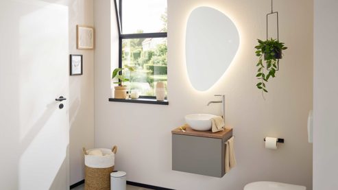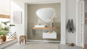 Der Spiegel mit LED-Beleuchtung aus der Interliving Bad Serie 3715 verbindet organisches Design mit moderner Lichttechnik. Als stilvoller Badezimmerspiegel, eleganter Badspiegel oder funktionaler Wandspiegel setzt er in deinem Badezimmer ein echtes Statement – und sorgt gleichzeitig für optimale Lichtverhältnisse am Waschplatz.