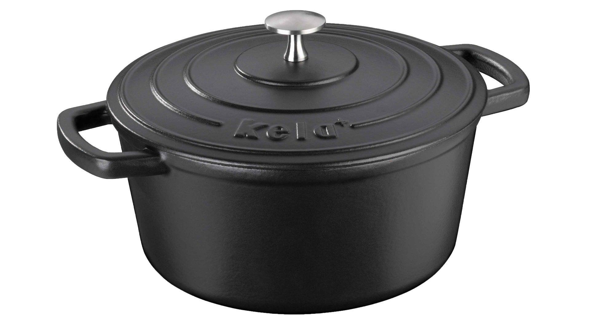 kela Bräter Calido | Gusseisen mit schwarzer Emaille-Beschichtung innen und außen | Größe Durchmesser ca. 24 x 12 (DxH) | Bodenfläche ca. 19 cm (Durchmesser) | Inhalt ca. 3,8 Liter | Edelstahl-Deckelknopf | große Griffe | einfache Reinigung | gleichmäßige Hitzeverteilung | gute Wärmespeicherung | energiesparend | perfekt für Anbraten und Schmoren | backofenfest bis 300 Grad Celsius | für alle Herdarten geeignet, auch für Induktion | zehn Jahre Hersteller-Qualitätsgarantie | in verschiedenen Farben und Größen bestellbar