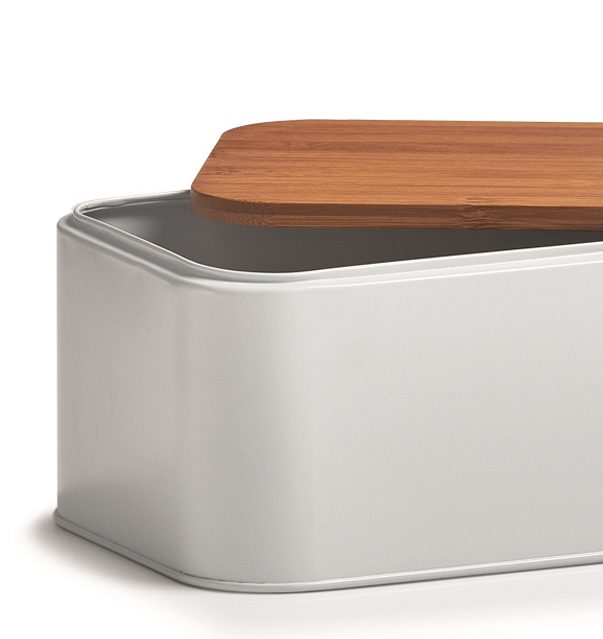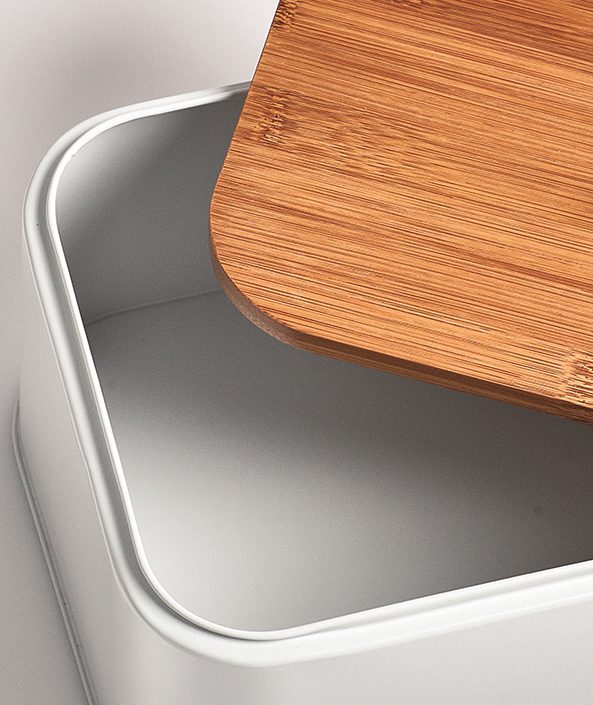 Dieser moderne Brotkasten aus weißem Metall und Bambus ist ein optisches Highlight in Ihrer Küche. Der Bambusdeckel sorgt dafür, dass Ihr Brot und Ihre Backwaren stets frisch und schmackhaft bleiben. Die Lüftungslöcher an der Rückseite ermöglichen eine optimale Luftzirkulation. Der praktische Küchenhelfer hat Abmessungen von ca. 31 x 12,5 x 18 cm (BxHxT).