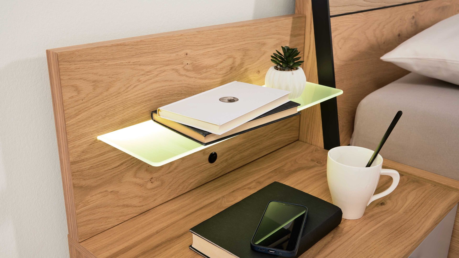 Die fest verbaute LED-Lichtquelle sorgt für eine gleichmäßige, blendfreie Ausleuchtung der Glasfläche und betont die hochwertige Materialanmutung der Paneelaufsätze. Zudem überzeugt die Beleuchtung durch ihre hohe Energieeffizienz und eine lange Lebensdauer – eine durchdachte Lichtlösung für moderne Schlafzimmer.