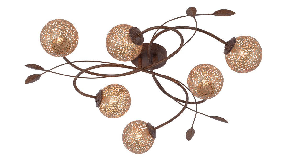 Die Paul Neuhaus LED-Deckenleuchte Greta leuchtet Ihren Wohnbereich wunderbar aus und fungiert zugleich als ansprechendes Dekoelement. Gefertigt aus rostfarbenem Metall in Kombination mit goldfarbenen Lampenschirmen beeindruckt die raffinierte Leuchte gleich auf den ersten Blick. Statten Sie die Deckenlampe einfach mit sechs G9-Leuchtmitteln mit je 40 Watt aus, die sich für die Energieeffizienzklasse A bis G eignen, und nehmen Sie das Lampenmodell direkt in Betrieb.