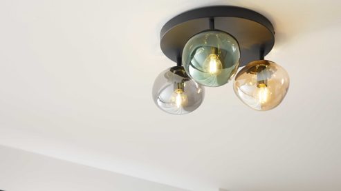 Die drei Glasschirme streuen das Licht angenehm und sorgen für eine wohnliche, harmonische Ausleuchtung. Mit ca. 39 cm Durchmesser und ca. 19 cm Höhe fügt sich die Wohnraum-Deckenlampe auch in kleinere Räume mühelos ein – stilvoll, zurückhaltend, trotzdem ein Blickfang.