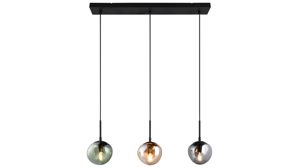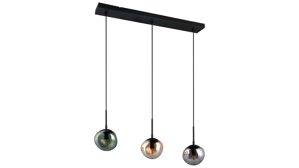 Mit der Hängelampe aus der Interliving Leuchten Serie 9350 bringst du ein echtes Design-Statement in deinen Wohnraum. DRei organisch geformte, matte Glas-Lampenschirme in den Farbtönen Amber, Grün und Rauch sorgen für ein lebendiges Lichtspiel, während der mattschwarze Metallsockel und die schwarzen Textilkabel der Pendelleuchte einen modernen Look verleihen.