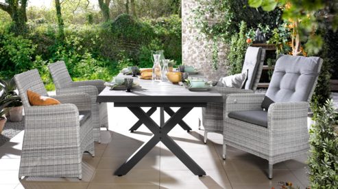 Der Ausziehtisch C31057 Sincro von Gautzsch überzeugt mit modernem Look und praktischer Funktion. Das anthrazitfarbene Aluminiumgestell harmoniert perfekt mit der edlen Keramikplatte in Naturgrau – stilvoll, pflegeleicht und wetterfest.