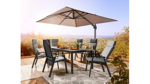 Der Move Sessel VALENCIA vereint modernes Design mit erstklassigem Sitzkomfort. Das stabile, pulverbeschichtete Aluminiumgestell in matt Anthrazit sorgt für eine elegante Optik und hohe Langlebigkeit. Die Sitz- und Rückenflächen aus Ranotex®-Gewebe in Dunkelgrau sind atmungsaktiv, wetterbeständig und besonders pflegeleicht.