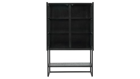 gebürstetes schwarz gebeiztes und lackiertes Mangoholz, kombiniert mit Klarglas und schwarzem Metall
