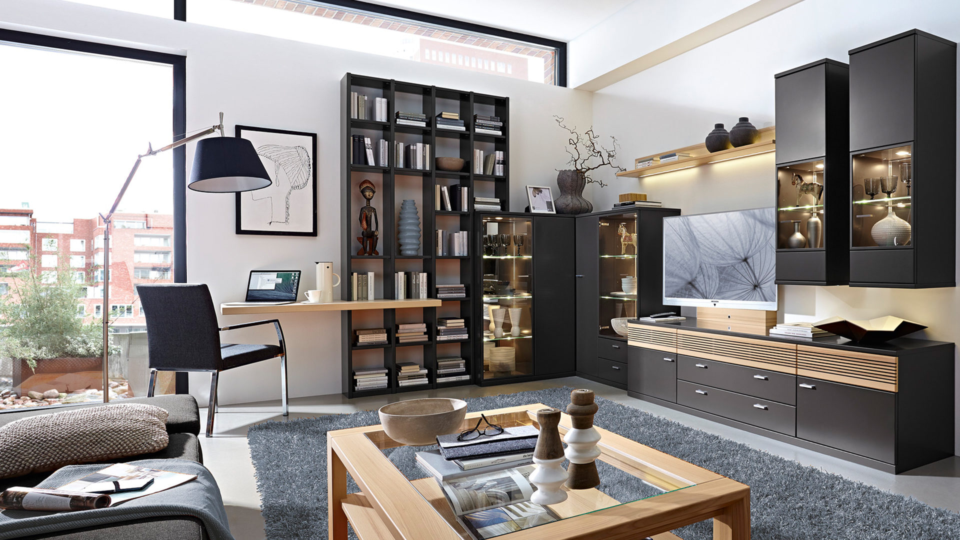 Die Möbel der Vancouver Eck-Wohnkombination präsentieren sich mit graphitfarbenen Lackoberflächen und Details in Kernbuchefurnier. Durch den Hell-Dunkel-Kontrast strahlt die Wohnwand warmen und tiefgründig-eleganten Charme aus. Für eine stimmig-moderne Abrundung sorgen die matt verchromten Metallgriffe.