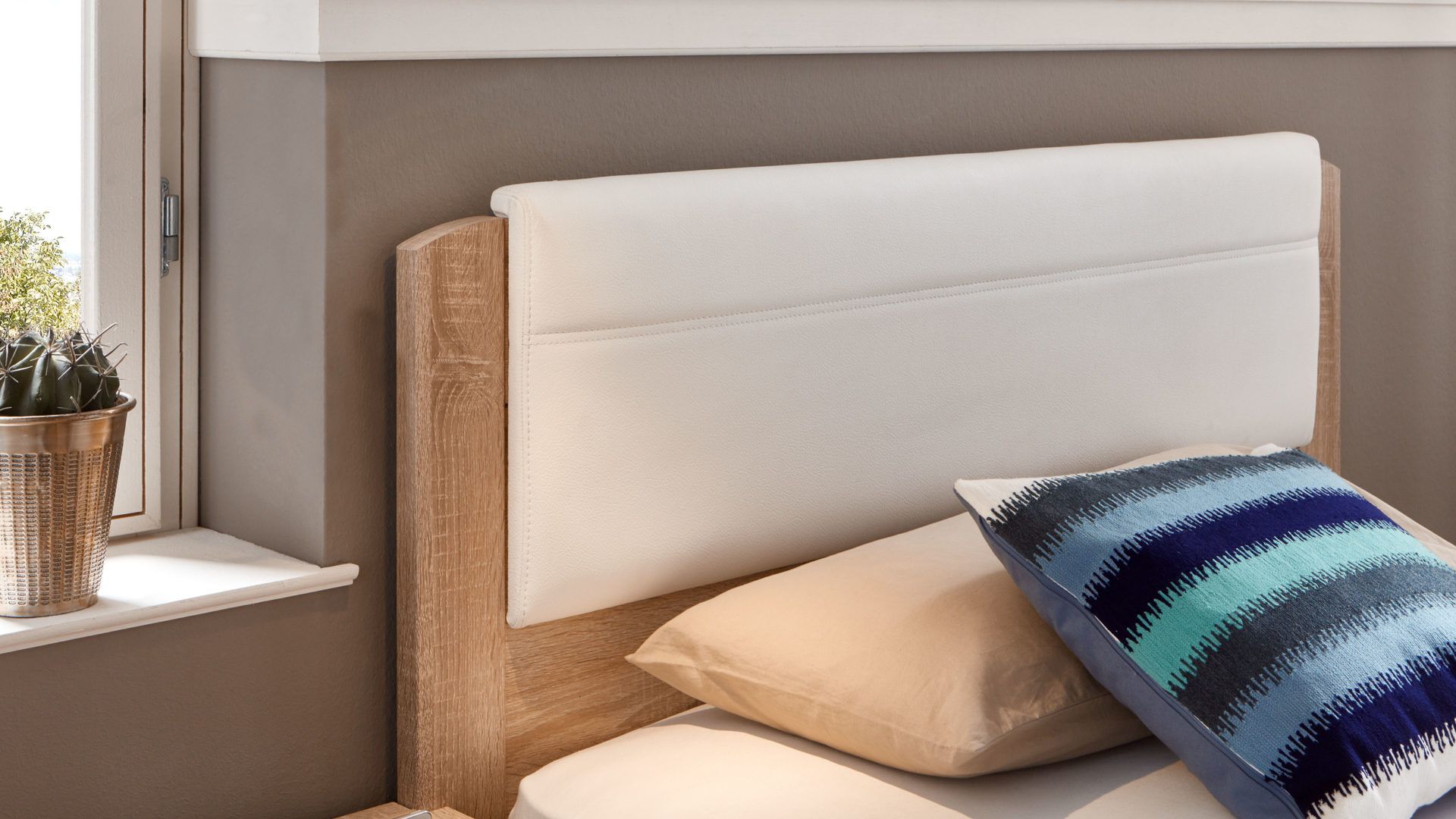 Das hochwertige STAUD Komfort-Bettgestell Smartliving kombiniert Sonoma eichefarbene Kunststoffoberflächen mit einem biancofarbenen Kunstlederbezug des gepolsterten Kopfteils zu einem stimmigen Ganzen. Durch die allgemein sehr helle Gestaltung präsentiert sich das Singlebett besonders elegant und freundlich-einladend. Darüber hinaus sind die Kunststoffoberflächen angenehm pflegeleicht.