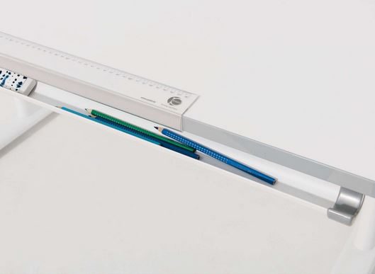 - Schreibtischplatte geteilt in eine neigungsfähige Hauptplatte (90 cm),