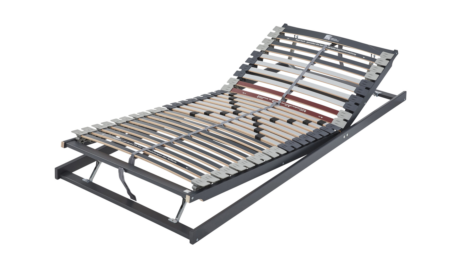 Die 28 Federholzleisten aus hochwertigem Buchenholz sind in elastischen Kautschukkappen gelagert. Sie verteilen die auftretenden Kräfte gleichmäßig auf die Rahmenkonstruktion und reagieren punktelastisch auf jede Bewegung. So wird dein Körper optimal gestützt, während deine Matratze geschont und ihre Lebensdauer verlängert wird.