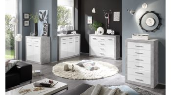 betonfarbene & weiße Kunststoffoberflächen – zwei Türen, vier Schubladen