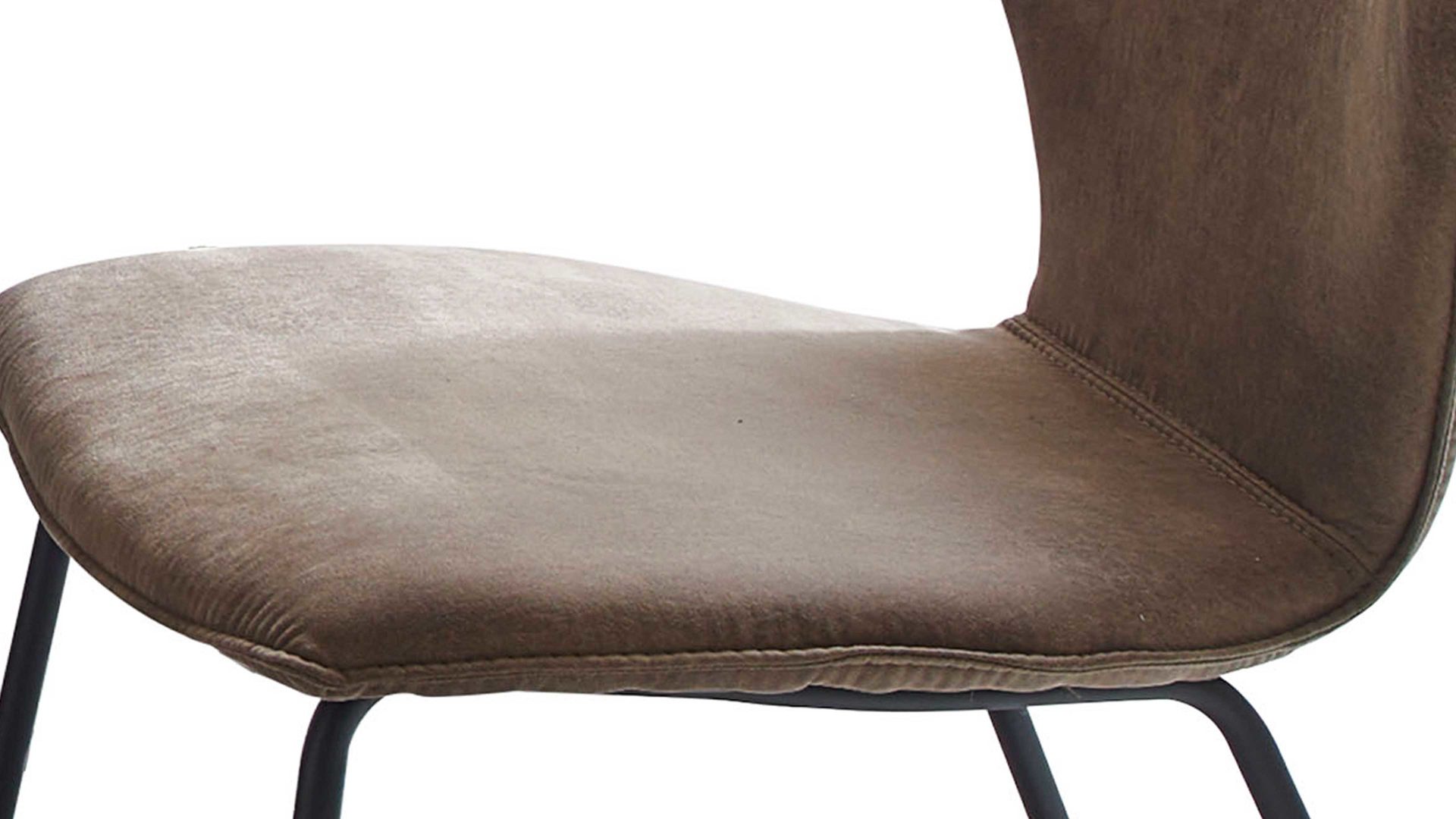 Er verfügt über einen moccafarbenen Stoffbezug, der mit nahezu jedem Einrichtungsstil harmoniert. Ein schwarzes Eisen-Kufengestell verleiht ihm zuverlässige Stabilität. Bei Maßen von ca. 47 x 83 x 41 cm (BxHxT) weist der Esszimmerstuhl eine Sitzhöhe von ca. 48 cm sowie eine Sitztiefe von ca. 48 cm auf.