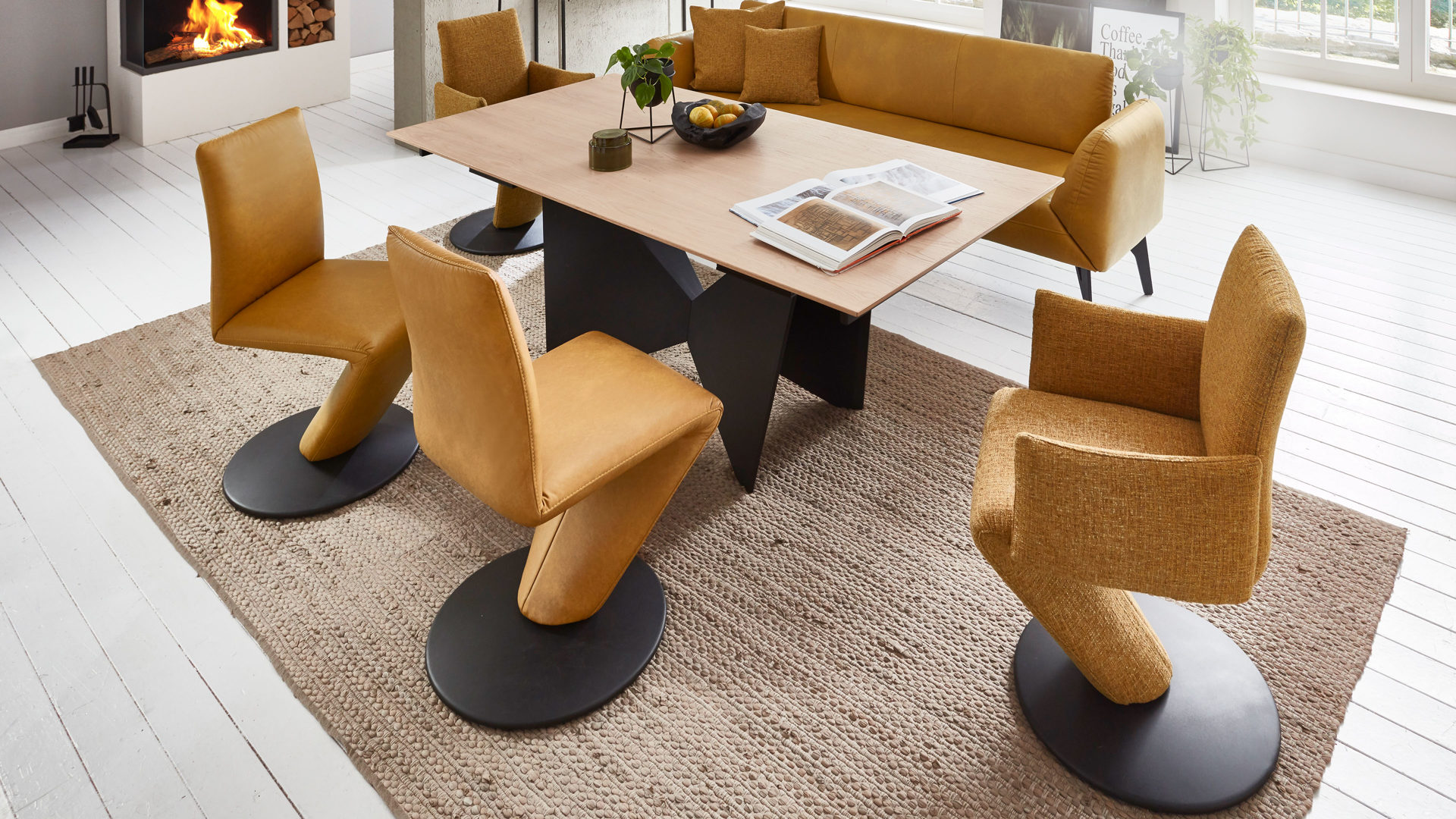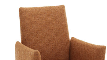 Er setzt sich aus einem schwarz pulverbeschichteten Metall-Tellerfuß mit Struktur und einem curcumafarbenen Webstoffbezug zusammen. Dank der perfekt aufeinander abgestimmten Materialien und Farben erscheint der Polsterstuhl absolut harmonisch und modern. Des Weiteren sorgen die geradlinige Formensprache, der hinten ebenfalls stoffbezogene Rücken und die schicken Zierkappnähte für besonders edles Flair.