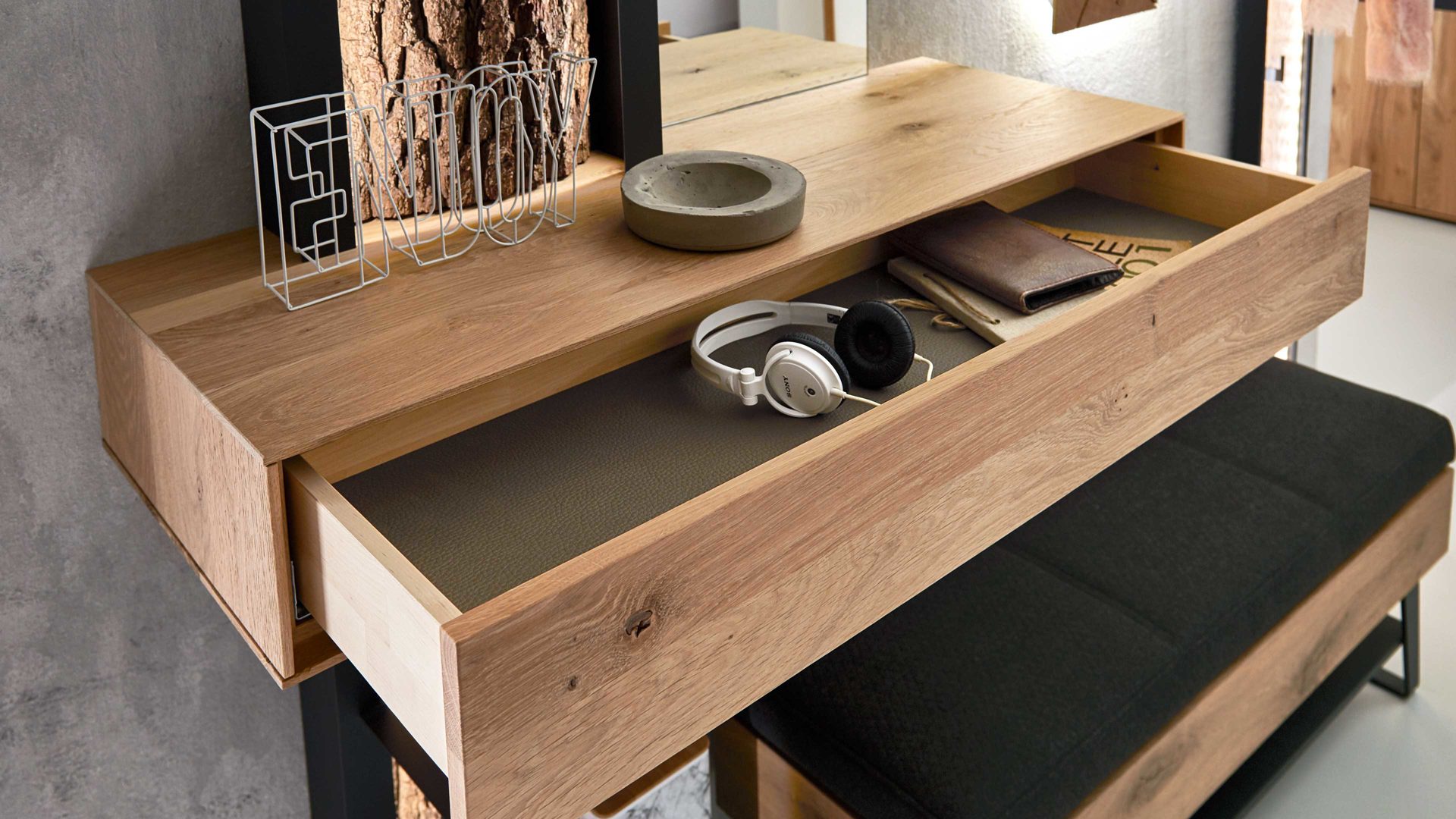 Das Spiegel-Stauraumelement Runa verbindet massive Kerneiche, hochwertiges Spiegelglas und anthrazitfarben pulverbeschichtetes Metall zu einem robusten, modernen und eindrucksvollen Ganzen. Bei der stark gebürsteten Kerneiche handelt es sich um erstklassiges Massivholz, das authentische Natürlichkeit in den Flur bringt. Durch die Oberflächenbehandlung mit zwei Schichten sehr matten UV-Wasserlacks und einem finalen Überzug aus Wachs ist das Holz extrem widerstandsfähig und langlebig. Der Spiegel und die metallene Rückwand wirken kontrastierend, fügen sich aber dennoch harmonisch ins Gesamtbild ein.