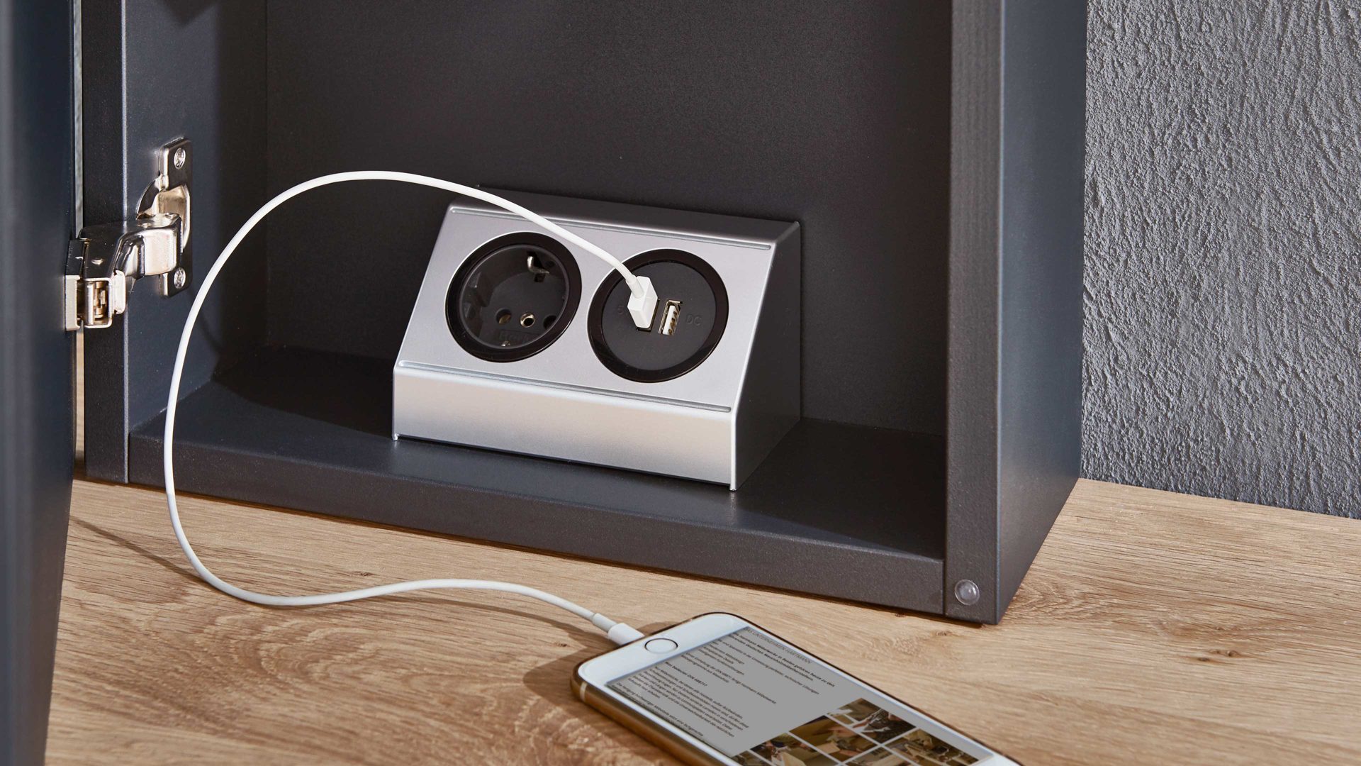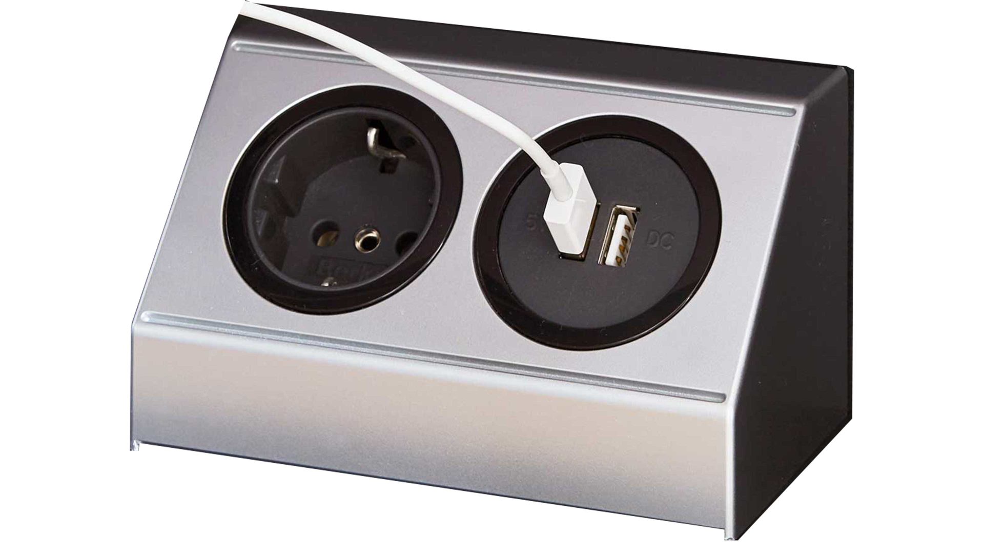 Sie ist aus silberfarbenem Kunststoff hergestellt und beherbergt eine Steckdose sowie zwei USB-Anschlüsse. Dadurch genießen Sie die Option, Smartphone und Co. bequem im Flur zu laden oder andere Elektrogeräte unkompliziert anzuschließen und zu nutzen.