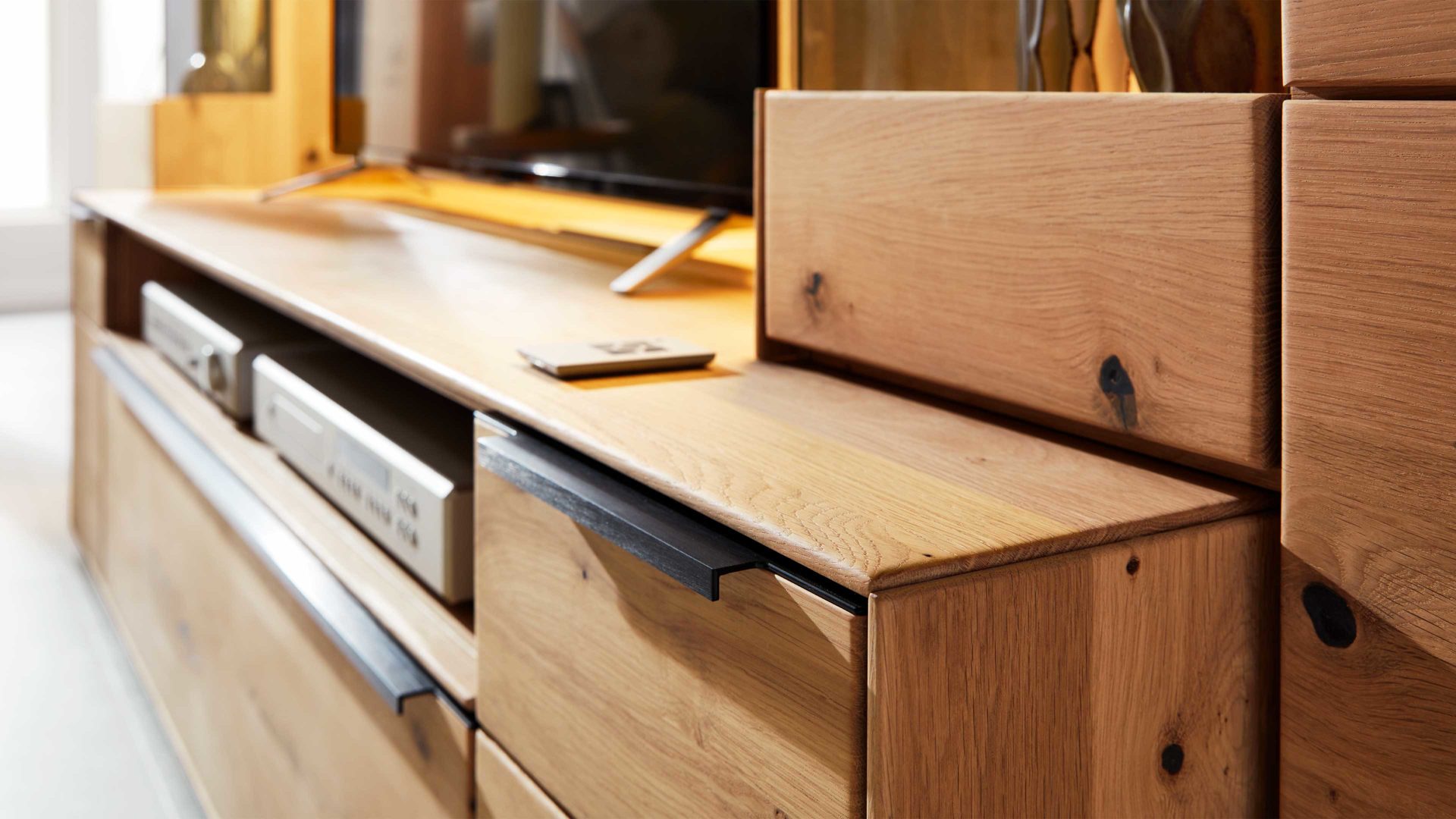 Das Medienmöbel lässt sich auf Wunsch mit LED-Beleuchtung, Mattglas-Akzenten und weiterem Medienzubehör erweitern – für ein rundum stimmiges Technik- und Wohnkonzept. Innerhalb der Serie stehen dir verschiedene Ausführungen zur Verfügung: Holzvarianten in Asteiche natur oder bianco geölt, Farbglasausführungen in drei stilvolle Varianten und zwei Griffvarianten.