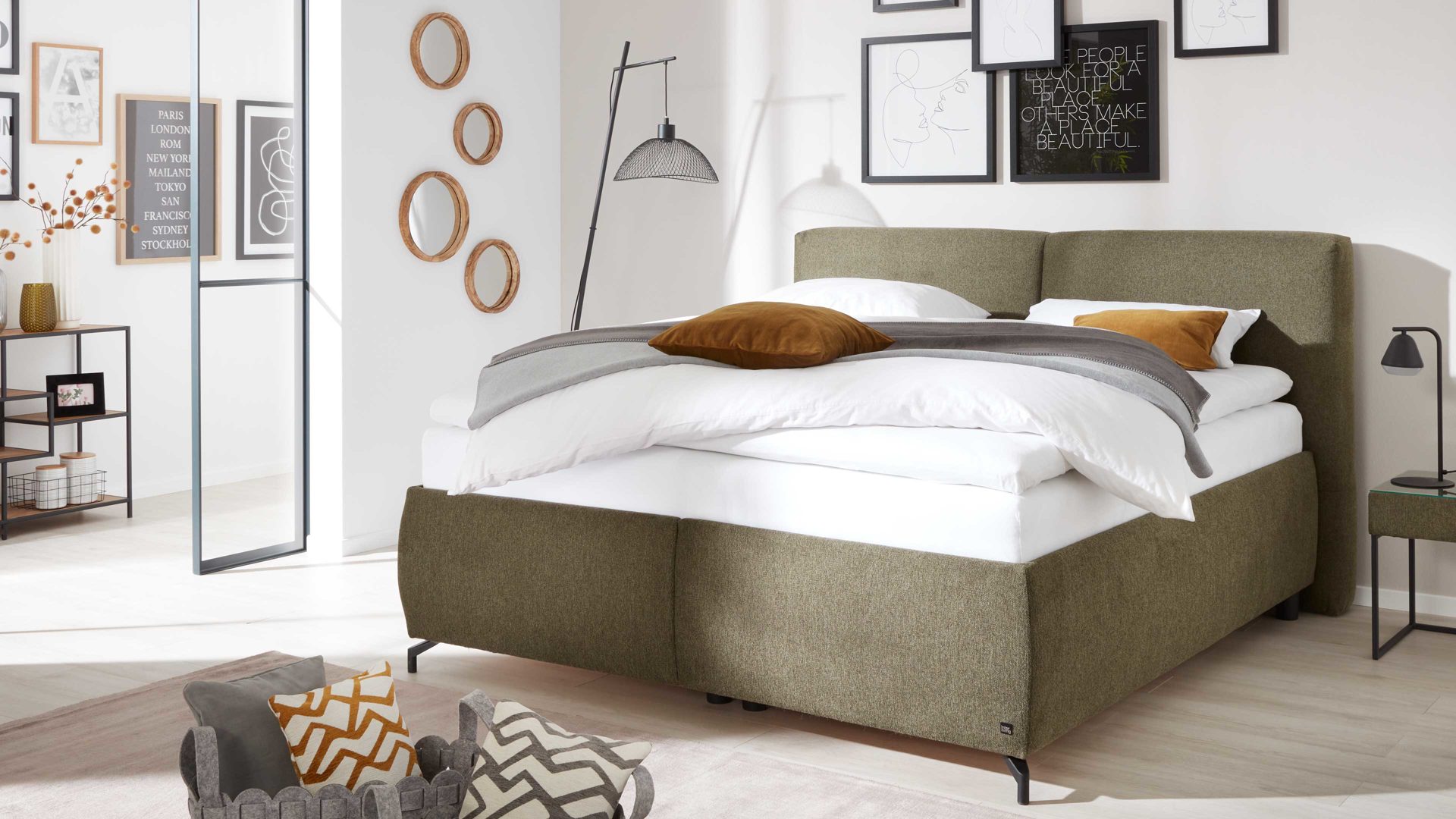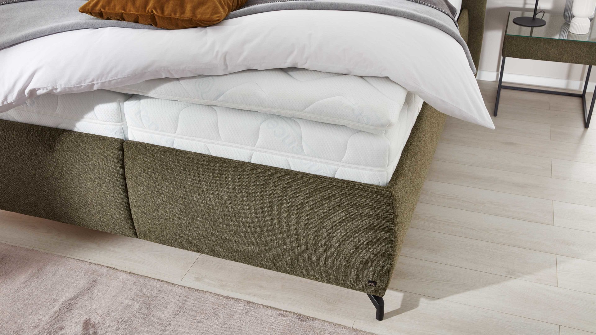Das Herzstück des Polsterbetts bildet der Bettkasten mit einer rundum stoffbezogenen Außenhülle und einem weiß beschichteten Innenbereich. Besonders praktisch: die integrierte Belüftung, die für optimale Luftzirkulation sorgt und so das Raumklima im Inneren verbessert. Damit eignet sich der Bettkasten ideal zur Aufbewahrung von Kissen, Bettdecken oder saisonaler Kleidung. Hier verbinden sich Design, Funktion und Komfort zu einem perfekt abgestimmten Schlafmöbel, das nicht nur schön aussieht, sondern auch im Alltag überzeugt.
