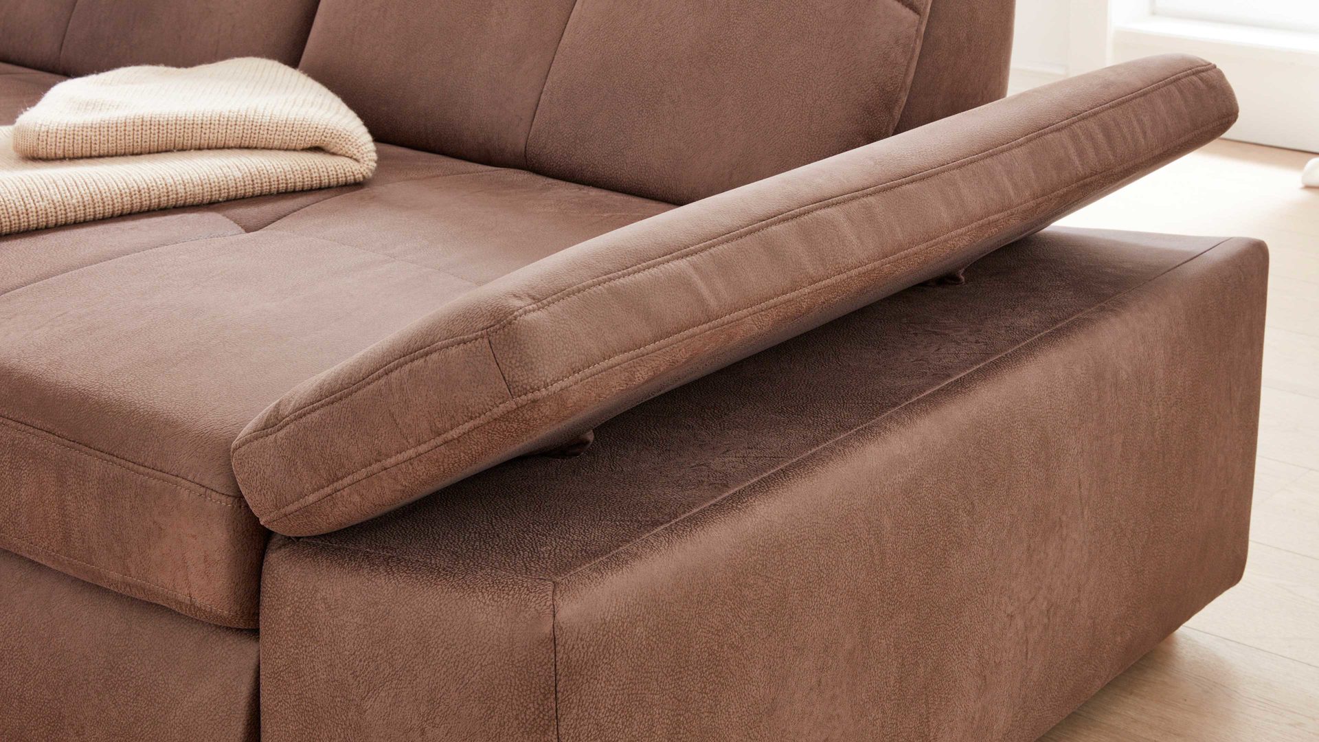 Die Armteilverstellung AV ist ein komfortables Mehrpreis-Extra für die Sofas mit Armlehne aus dem Modulmaster-Programm MM-MP1044. Mittels Rasterbeschlag können Sie die Armlehne mehrfach verstellen. Dadurch eignet sie sich sogar als Kopfablage bei einem entspannenden Nickerchen auf der jeweiligen Couch.