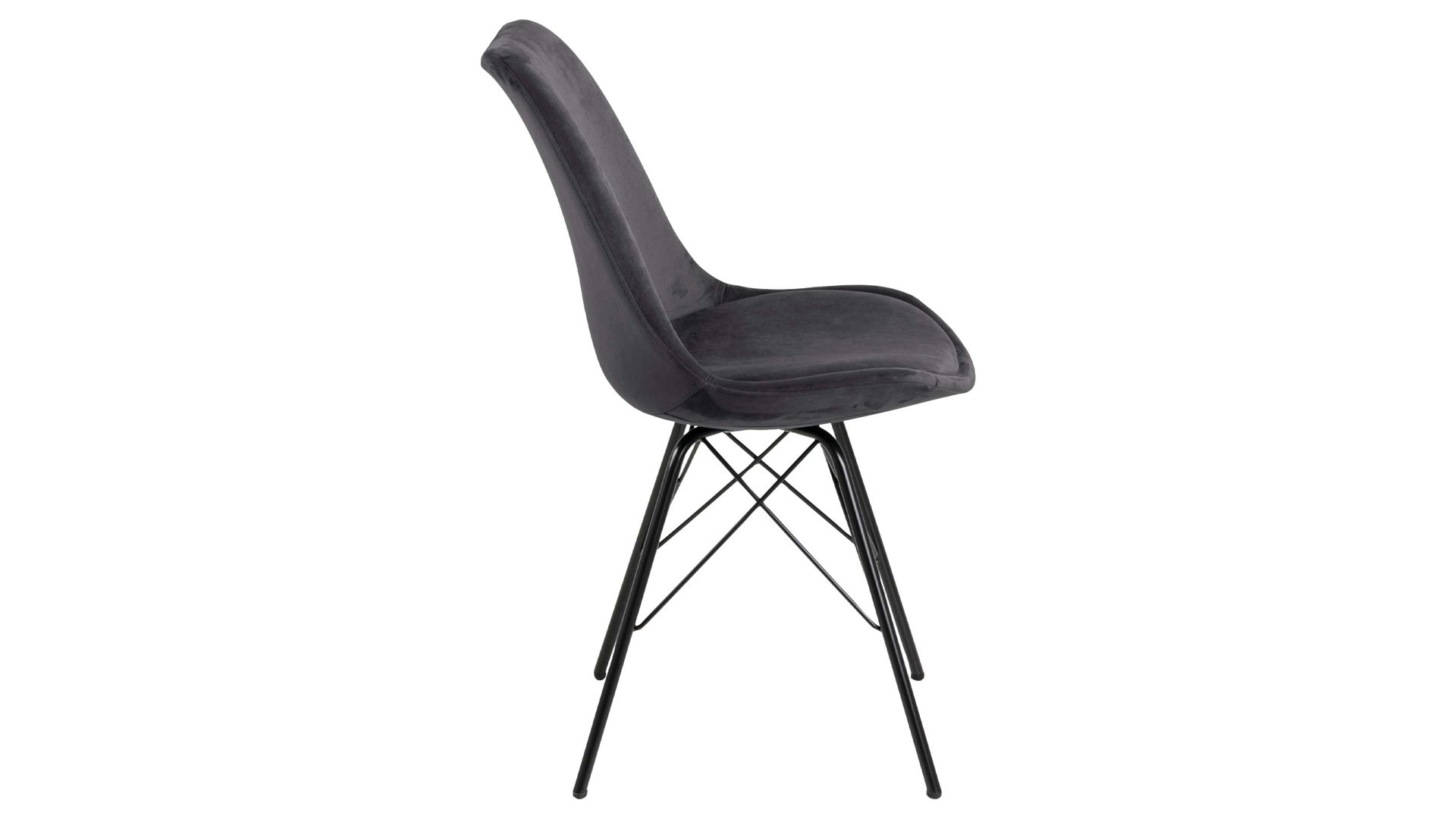 Dieser Polsterstuhl verkörpert Eleganz. Als stabile, dabei aber wunderbar filigran designte Basis fungiert ein mattschwarz pulverbeschichtetes Stahldrahtgestell. Darauf befindet sich eine dunkelgraue Sitzschale aus robustem Kunststoff. Sie ist rundherum mit Samt bezogen, ebenfalls in klassischem Dunkelgrau. Der trendige Samtbezug überzeugt sowohl qualitativ als auch optisch und haptisch.