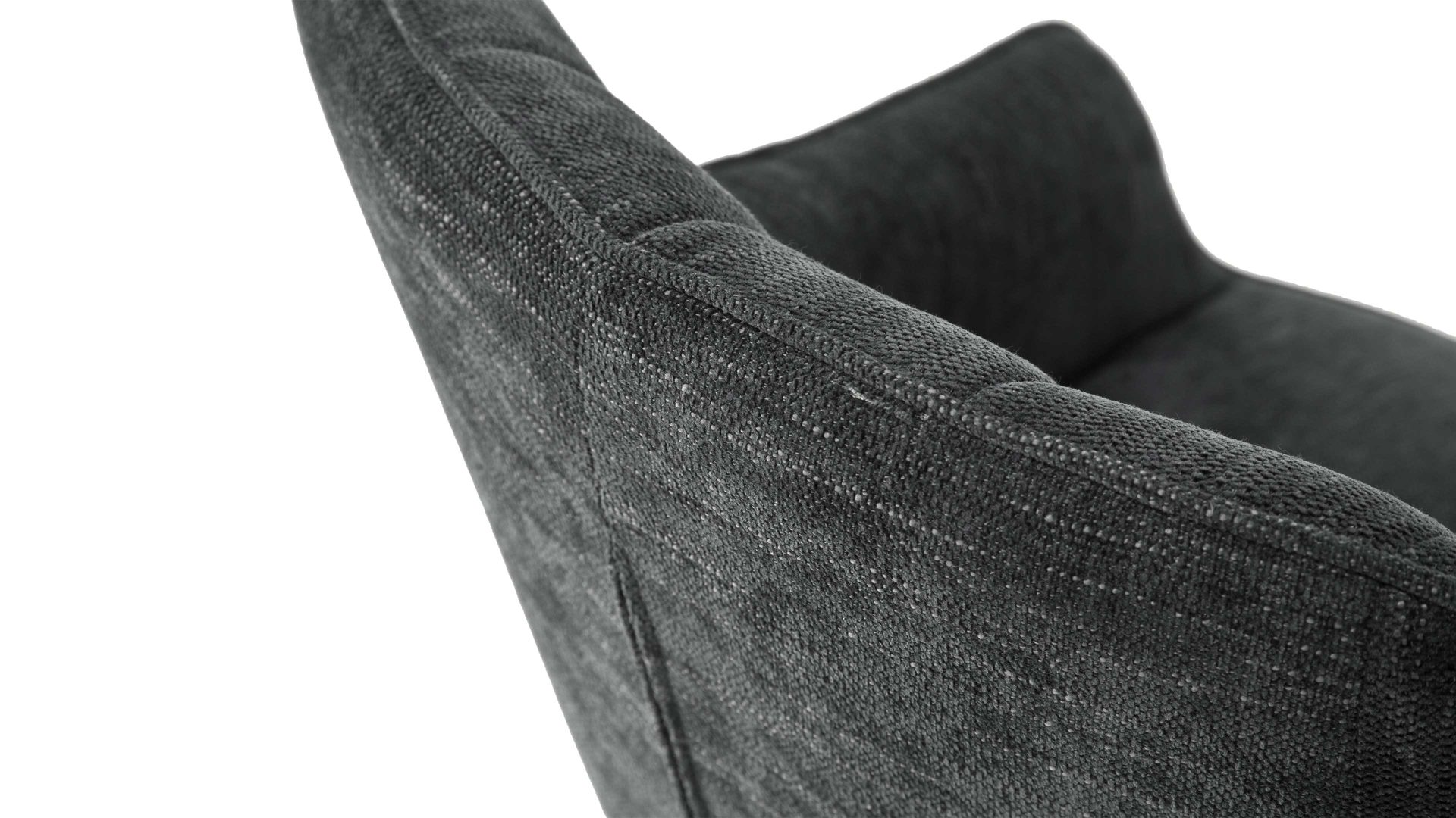 Der Armlehnstuhl Sasselo kommt in einem ausdrucksstarken Design: Seine Sitzschale ist komplett mit einem Chenillebezug in gedecktem Anthrazit umhüllt. Entlang aller Kanten verstärkt Keder den Stuhl, während die Rückenlehne hübsche Steppnähte mitbringt. Getragen wird der Drehsessel von einem schwarz lackierten und konisch zulaufenden Vierkantrohrgestell.