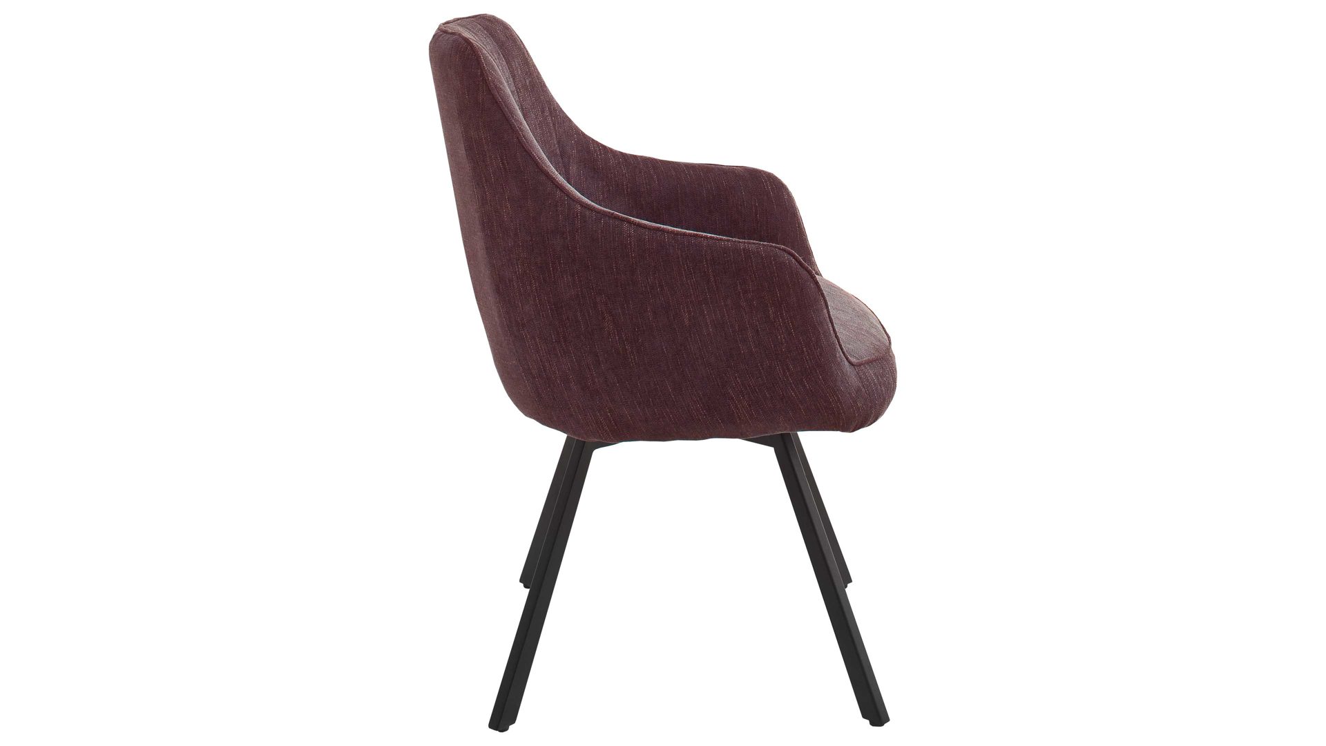 Der Armlehnstuhl Sasselo kommt in einem ausdrucksstarken Design: Seine Sitzschale ist komplett mit einem Chenillebezug in tiefem Merlot umhüllt. Entlang aller Kanten verstärkt Keder den Stuhl, während die Rückenlehne hübsche Steppnähte mitbringt. Getragen wird der Drehsessel von einem schwarz lackierten und konisch zulaufenden Vierkantrohrgestell.