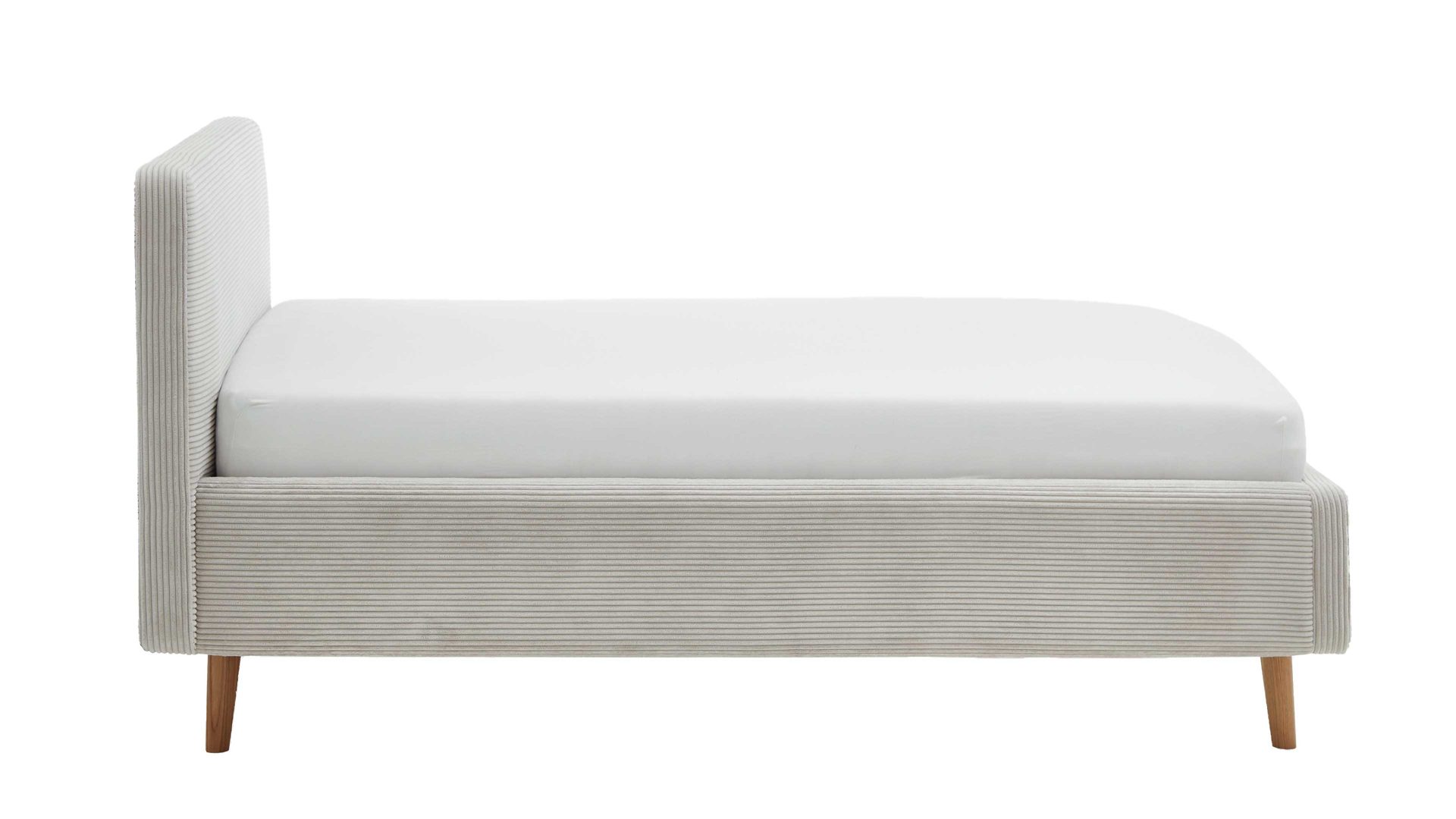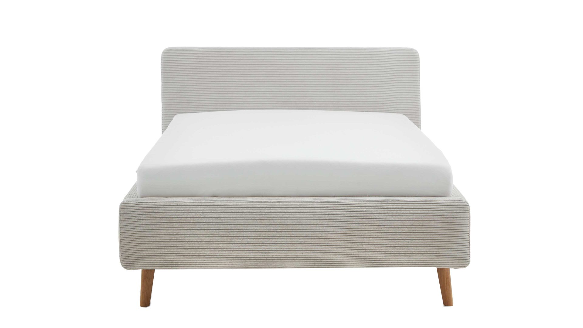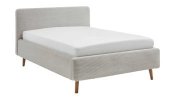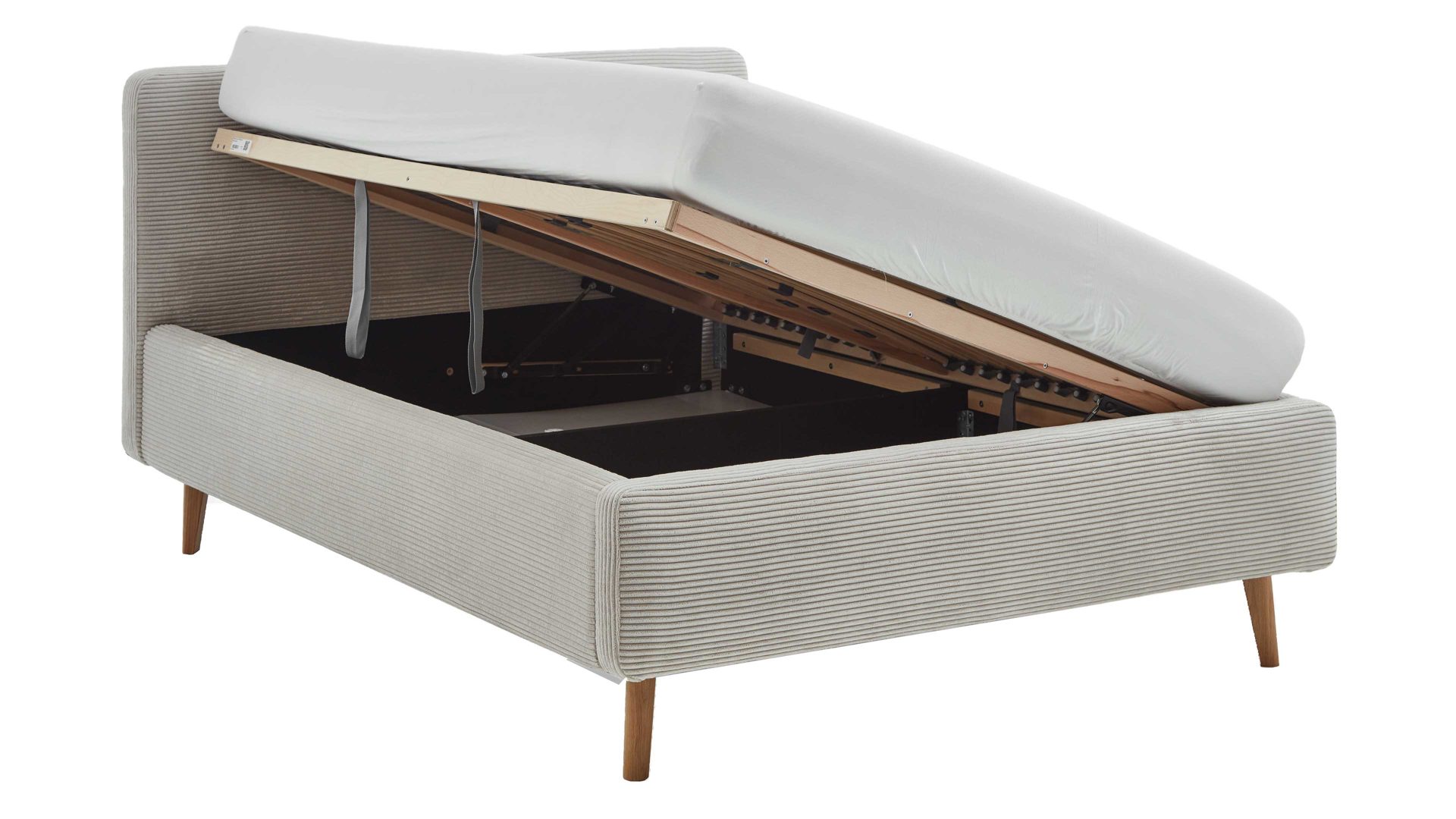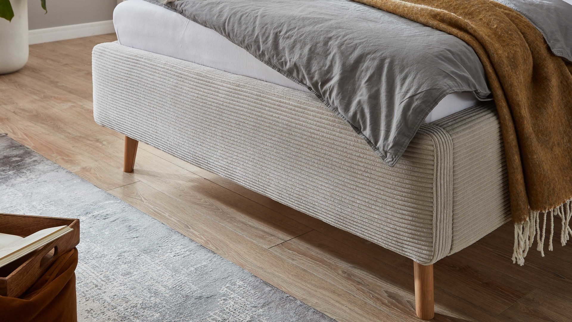 Das Polsterbettgestell Mattis mit Bettkasten begeistert durch die elegante Trendoptik sowie die exzellente Material- und Verarbeitungsqualität. Es kombiniert eichefarbene Holzfüße mit einem beigefarbenen Breitcordbezug. Sowohl die Bettseiten als auch das Polsterkopfteil sind glatt bezogen. Letzteres lädt Sie ein, sich anzulehnen, wenn Sie abends im Bett vor dem Schlafen noch fernsehen oder in einem Buch lesen.