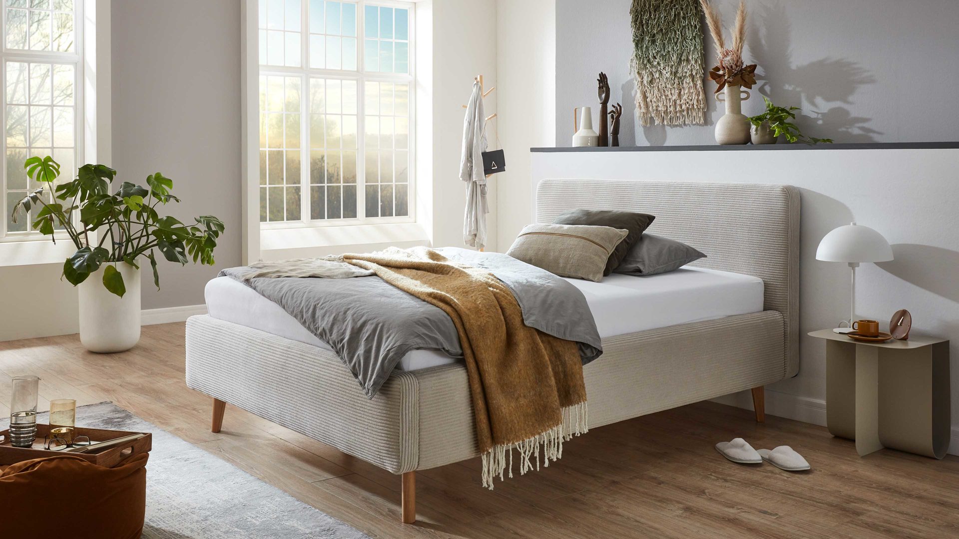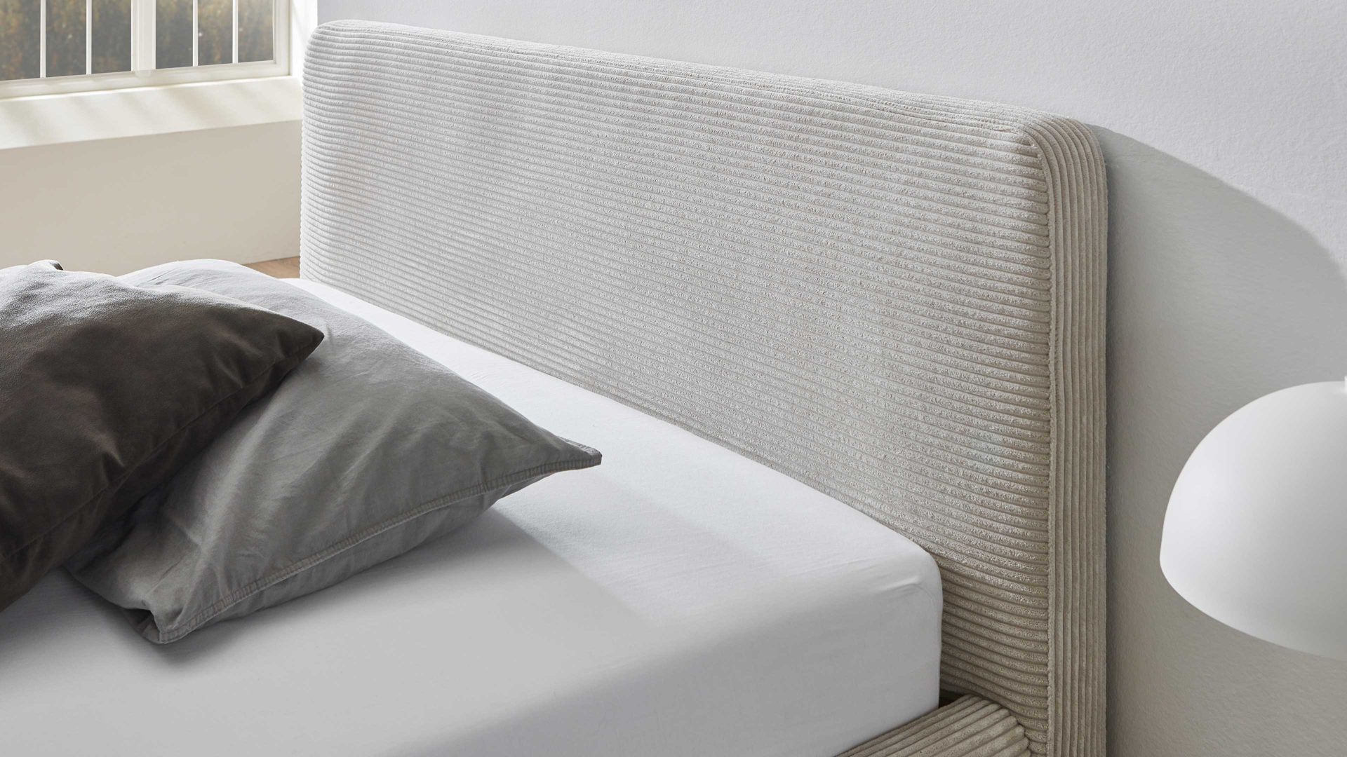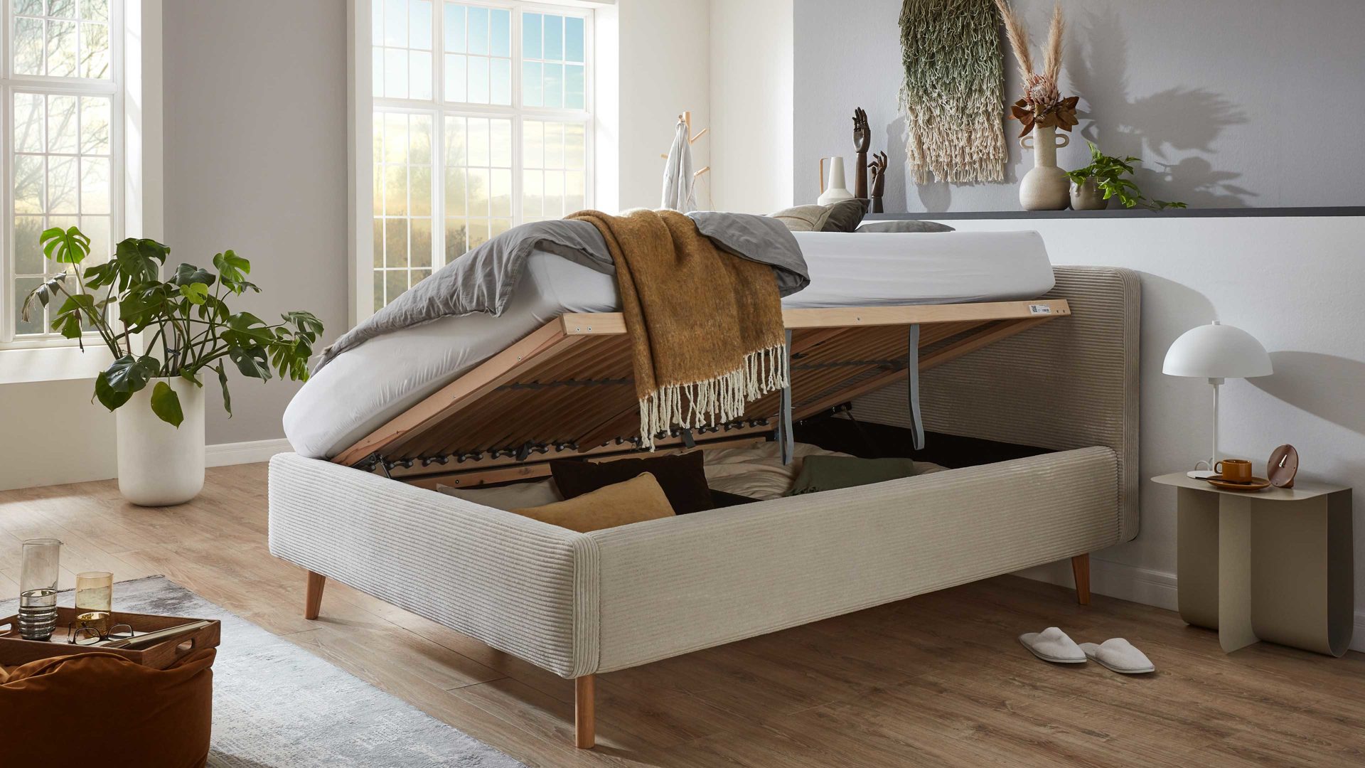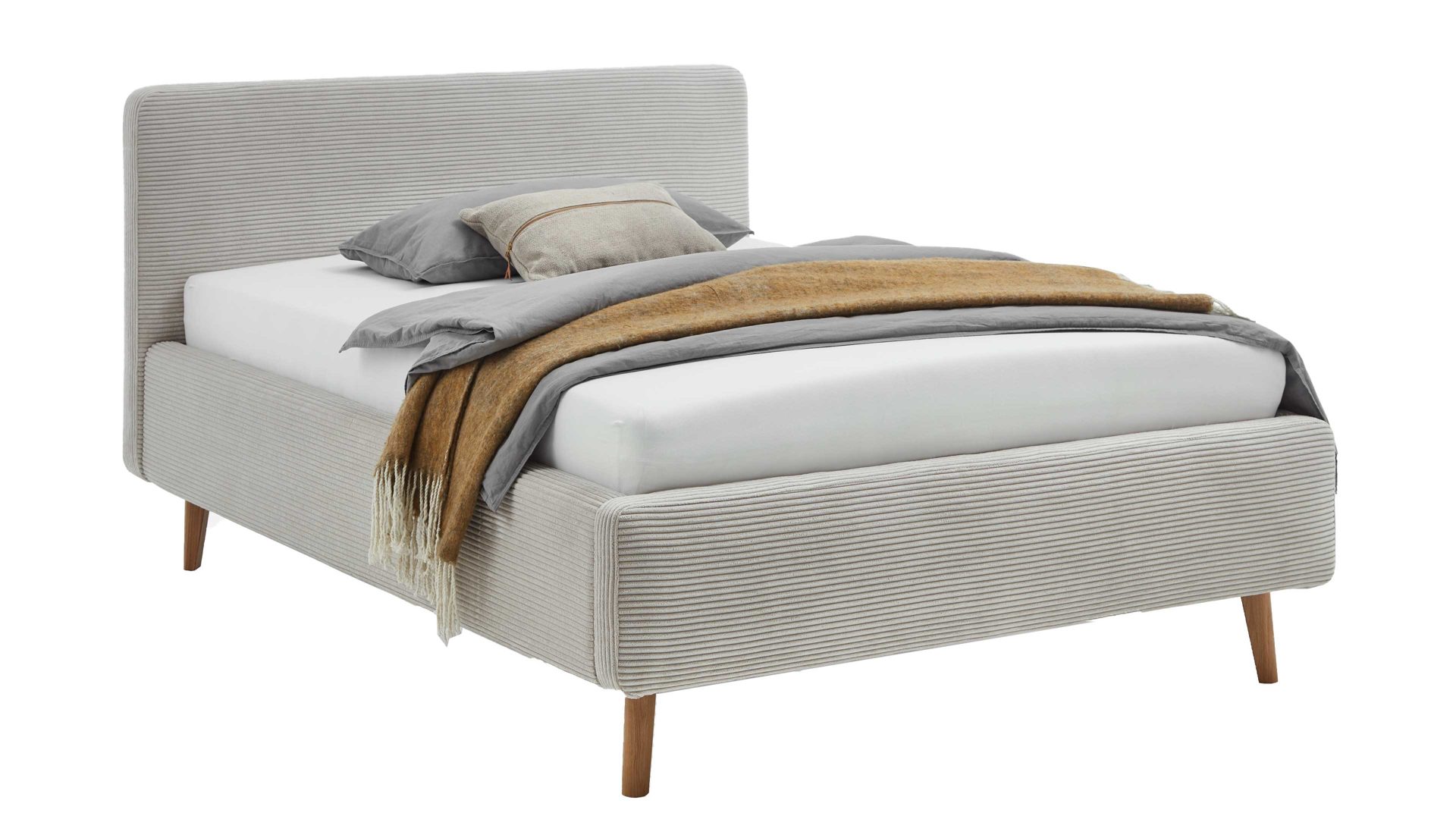 Das Polsterbettgestell Mattis mit Bettkasten begeistert durch die elegante Trendoptik sowie die exzellente Material- und Verarbeitungsqualität. Es kombiniert eichefarbene Holzfüße mit einem beigefarbenen Breitcordbezug. Sowohl die Bettseiten als auch das Polsterkopfteil sind glatt bezogen. Letzteres lädt Sie ein, sich anzulehnen, wenn Sie abends im Bett vor dem Schlafen noch fernsehen oder in einem Buch lesen.