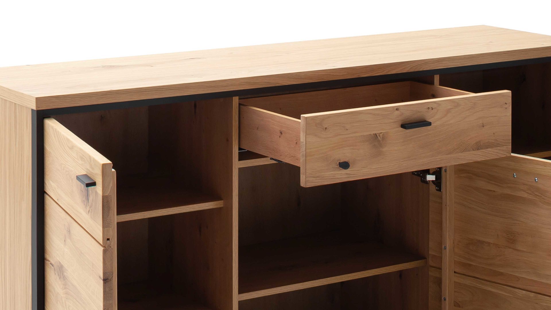 Mit dem Sideboard Bari erweitern Sie Ihren Wohnraum dekorativ. Die schicke Kombikommode ist in einem zeitlos eleganten Design gehalten. Ihre massive biancofarben geölte Asteiche-Front wirkt natürlich und dezent. In Kombination mit der ebenfalls biancofarbenen Eiche-Nachbildung innen und dem geölt furnierten Korpus außen entsteht ein attraktiver Look, der zu verschiedenen Einrichtungsstilen passt, von Industrial und nordischem Minimalismus bis hin zum gemütlichen Landhausstil. In Schwarzgrau fügen sich Griff und Aluminiumleisten stimmig in das Gesamtbild ein.