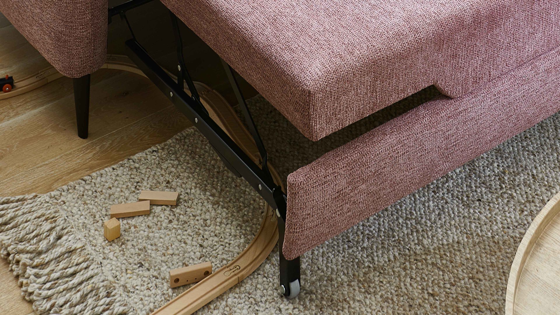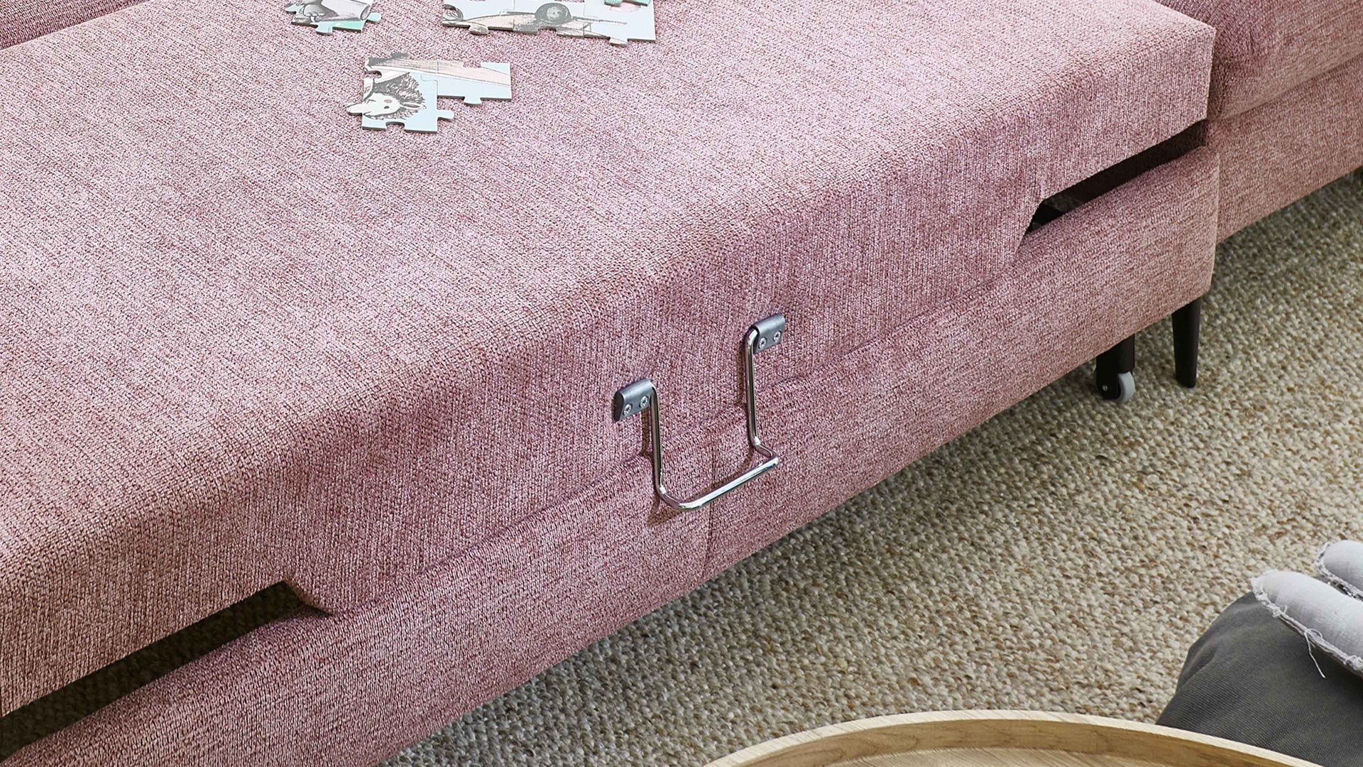 So geht's: Ziehen Sie die Sitzfläche mit dem verchromten Metallgriff nach vorn und leicht nach oben zur Liegefläche aus. Durch den hochwertigen Drellbezug und die softe Kaltschaumpolsterung auf einer stützenden Wellenunterfederung bietet die Querschläferfunktion hohen Liegekomfort.