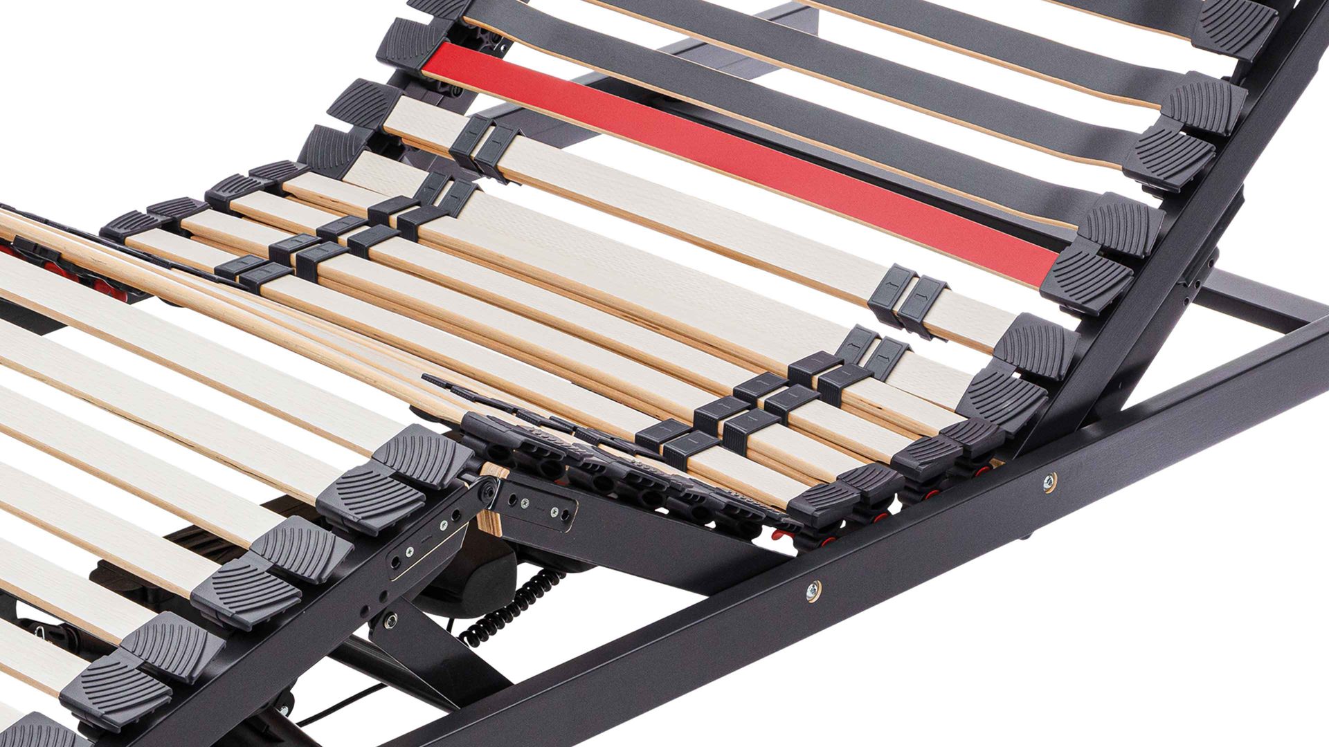Die elastischen Federleisten sind in langlebigen Hightech-Kappen gelagert, die dauerhaft flexibel bleiben und geräuscharm arbeiten. Verstärkte Querleisten mit Winkelsicherung sowie hochfeste Gelenkschrauben aus Stahl erhöhen die Stabilität zusätzlich und sorgen für eine dauerhaft sichere Konstruktion.