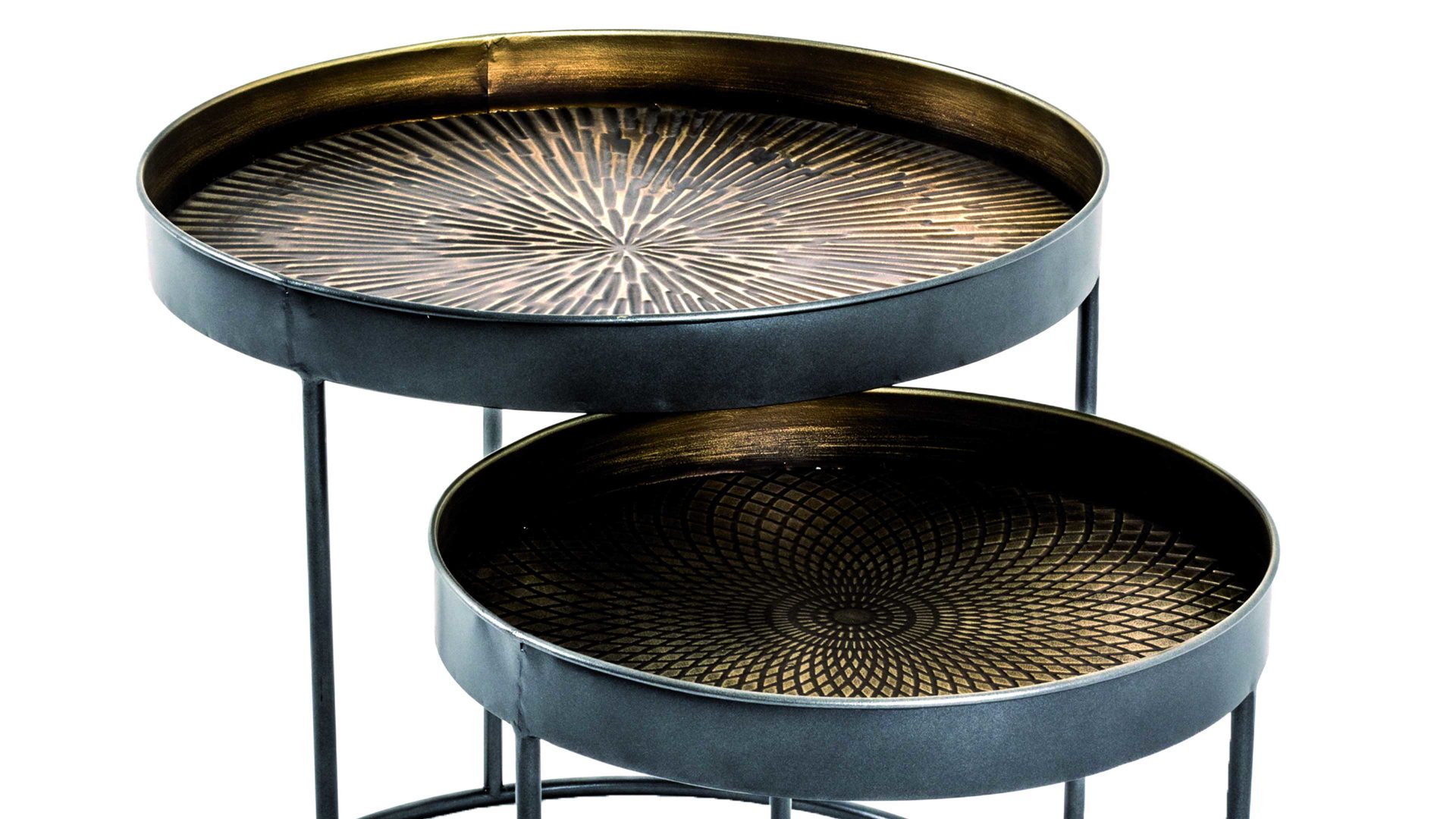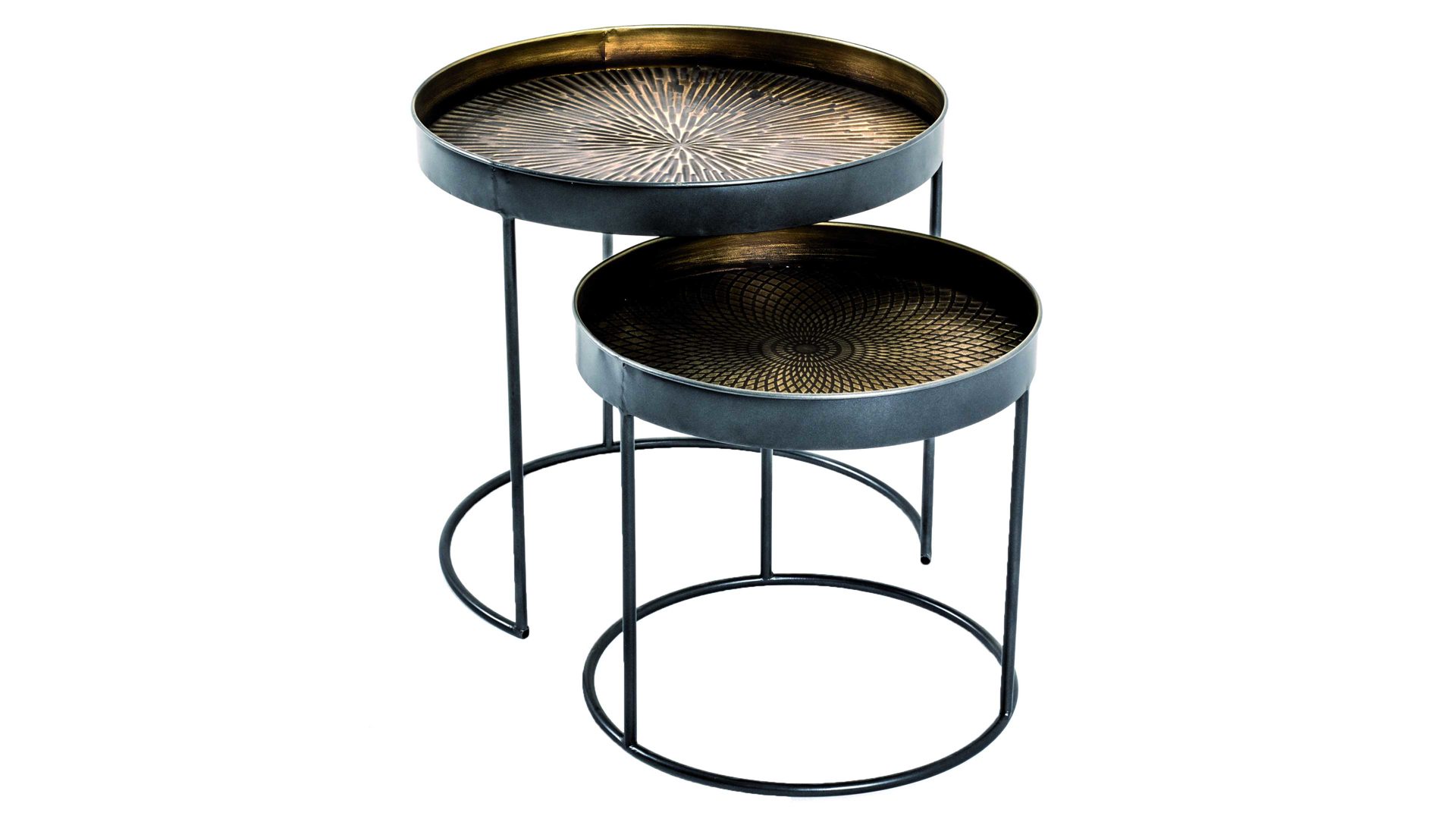 Beide Tischchen verbinden ein puristisch schwarz lackiertes Metallgestell mit einer schwarz-kupferfarben gewischten Metallablage. Sie präsentieren sich modern und elegant - mit dem gewissen Etwas durch das Muster auf den Tischplatten. Dank der hochwertigen Materialien sind die Beistelltische sehr robust, widerstandsfähig und langlebig. Zudem begeistern die pflegeleichten Oberflächen.